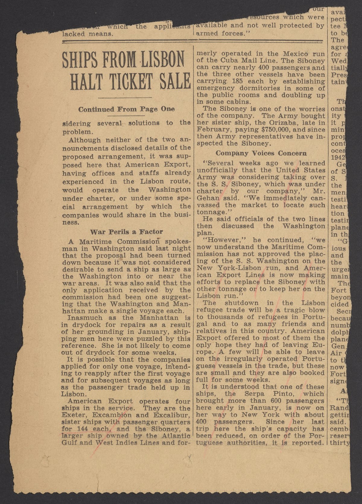 “Ships from Lisbon Halt Ticket Sale,” circa 1941. Papers of Georg and Max Bredig, Box 10, Folder 24. Science History Institute. Philadelphia. https://digital.sciencehistory.org/works/s1sooxz.
