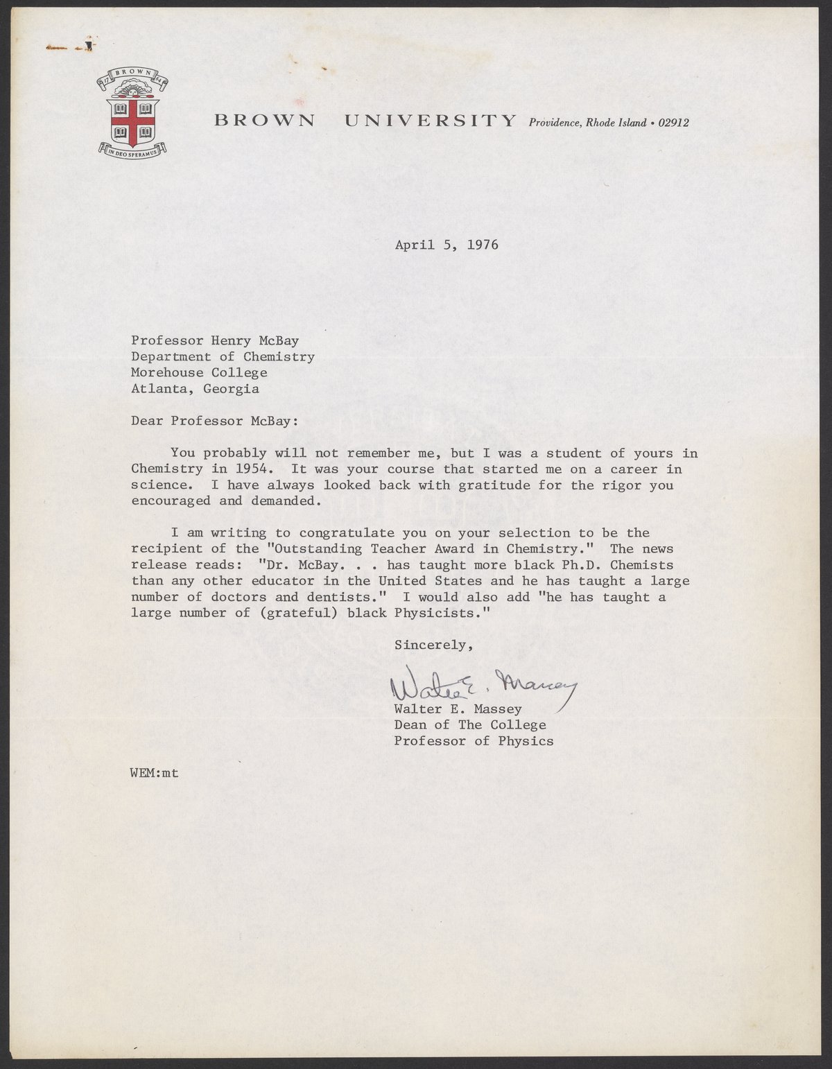 Letter from Dr. Walter E. Massey to Dr. Henry McBay