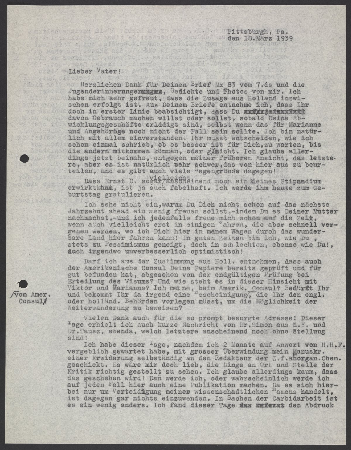 Letter from Max Bredig to Georg Bredig, March 18, 1939