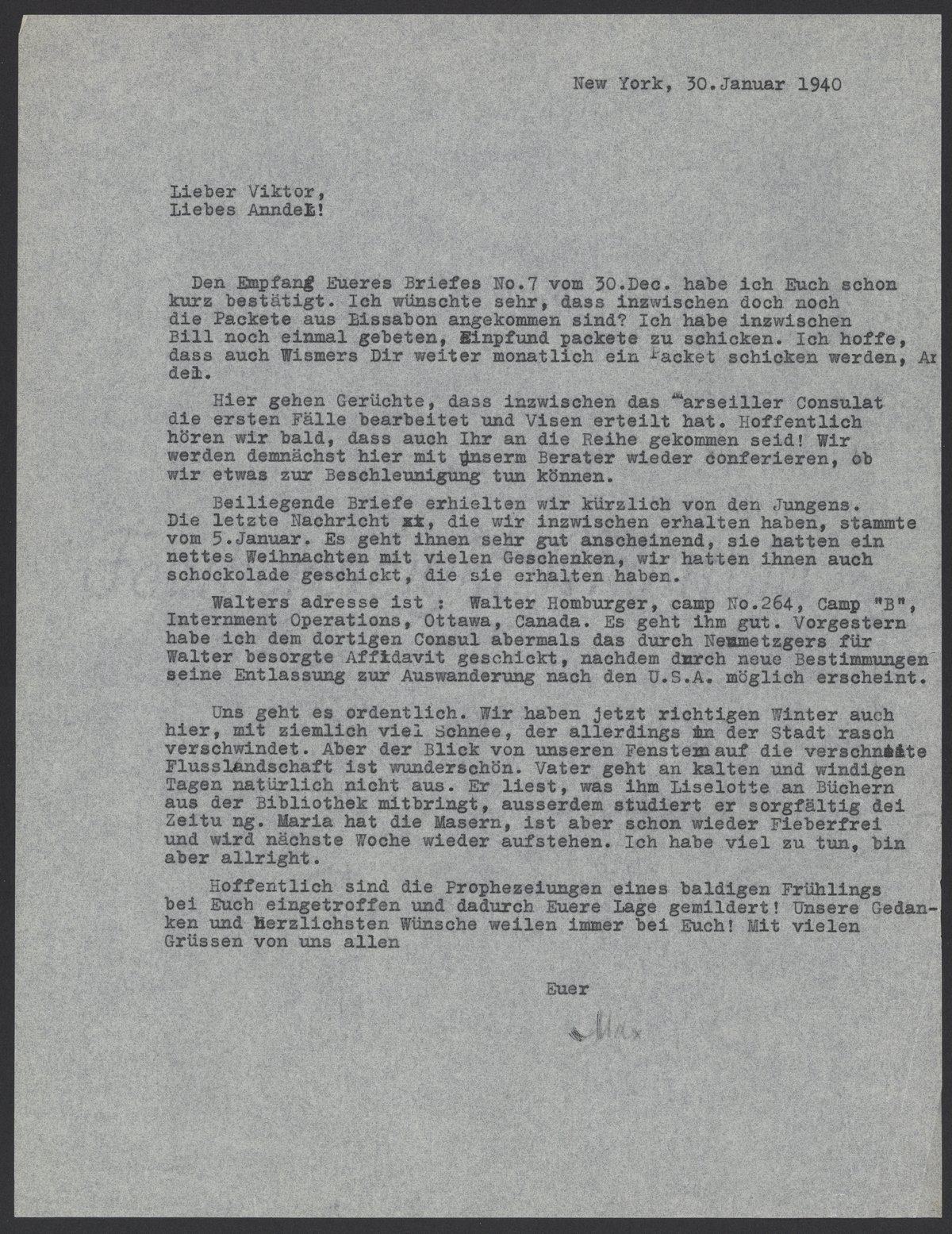 Walters Adresse ist: Walter Homburger, camp no. 264, Camp „B“, Internment Operations, Ottawa, Canada. Es geht ihm gut. Vorgestern habe ich dem dortigen Consul abermals das durch Neumetzgers für Walter besorgte Affidavit geschickt, nachdem durch neue Bestimmungen seine Entlassung zur Auswanderung nach den U.S.A möglich erscheint.