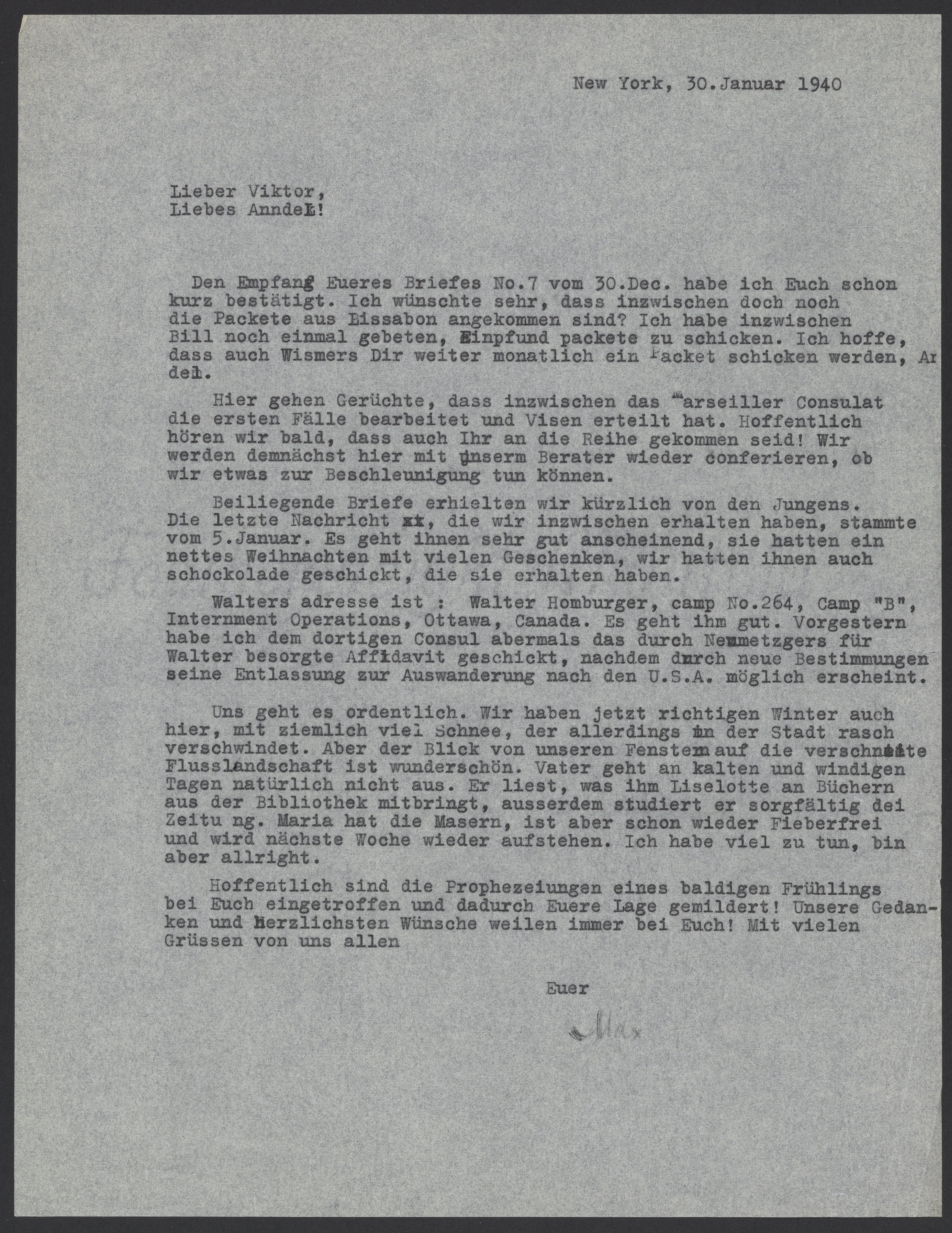 Walters Adresse ist: Walter Homburger, camp no. 264, Camp „B“, Internment Operations, Ottawa, Canada. Es geht ihm gut. Vorgestern habe ich dem dortigen Consul abermals das durch Neumetzgers für Walter besorgte Affidavit geschickt, nachdem durch neue Bestimmungen seine Entlassung zur Auswanderung nach den U.S.A möglich erscheint.