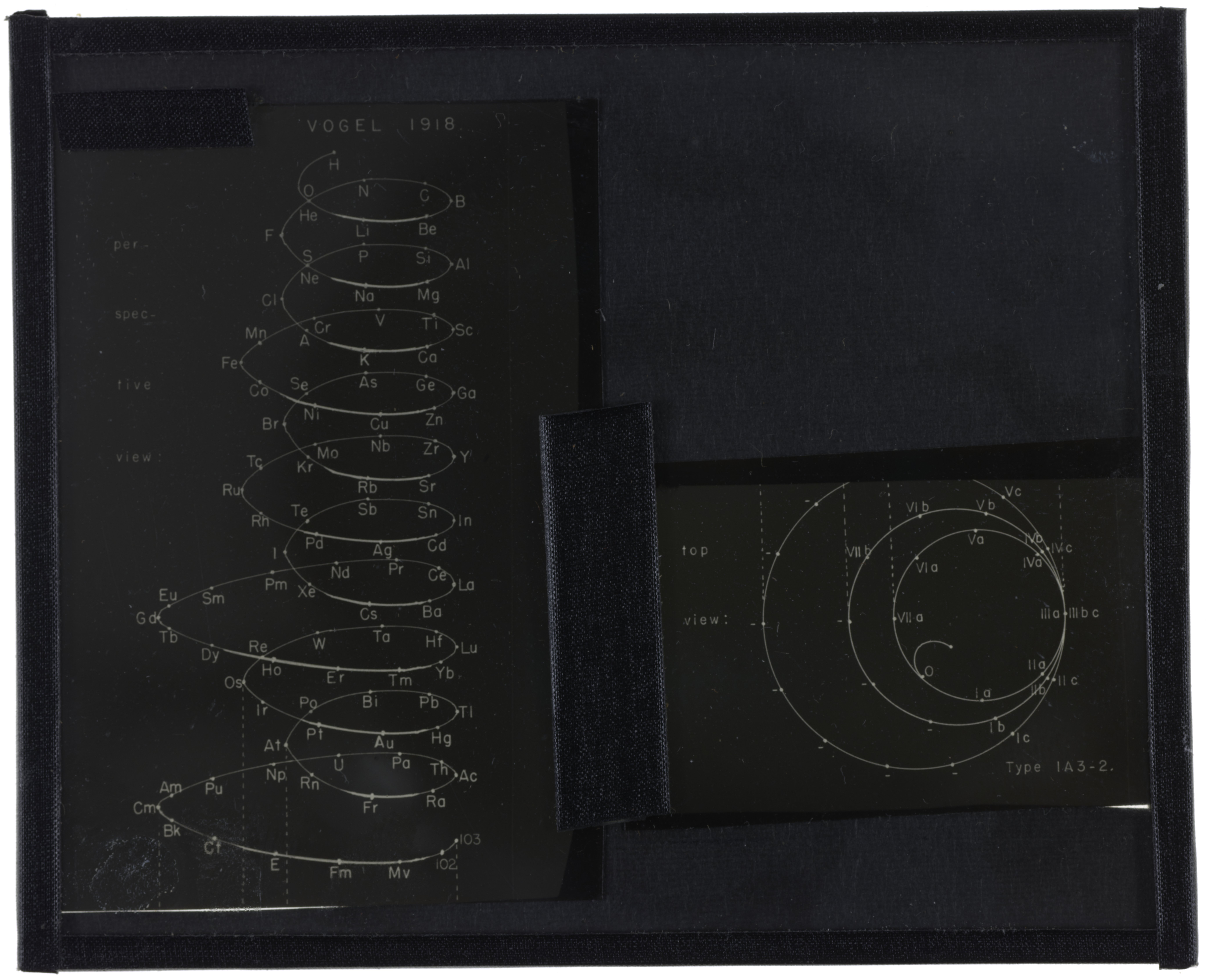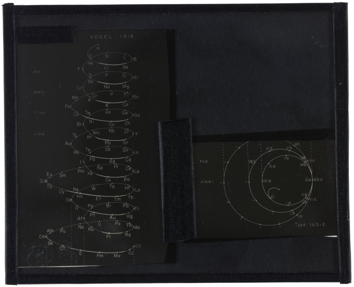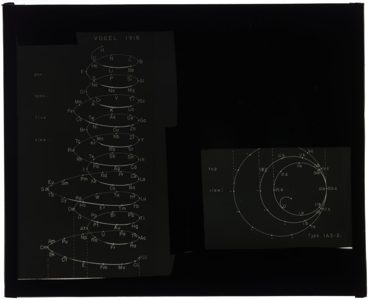 Vogel, Rudolf, and Edward G. Mazurs. “Periodic Table in Style of Helix with Three Sizes of Revolutions.” Glass (material), 1918–1957. Edward G. Mazurs Collection of Periodic Systems Images, Box 1. Science History Institute. Philadelphia. https://digital.sciencehistory.org/works/s4655h213.