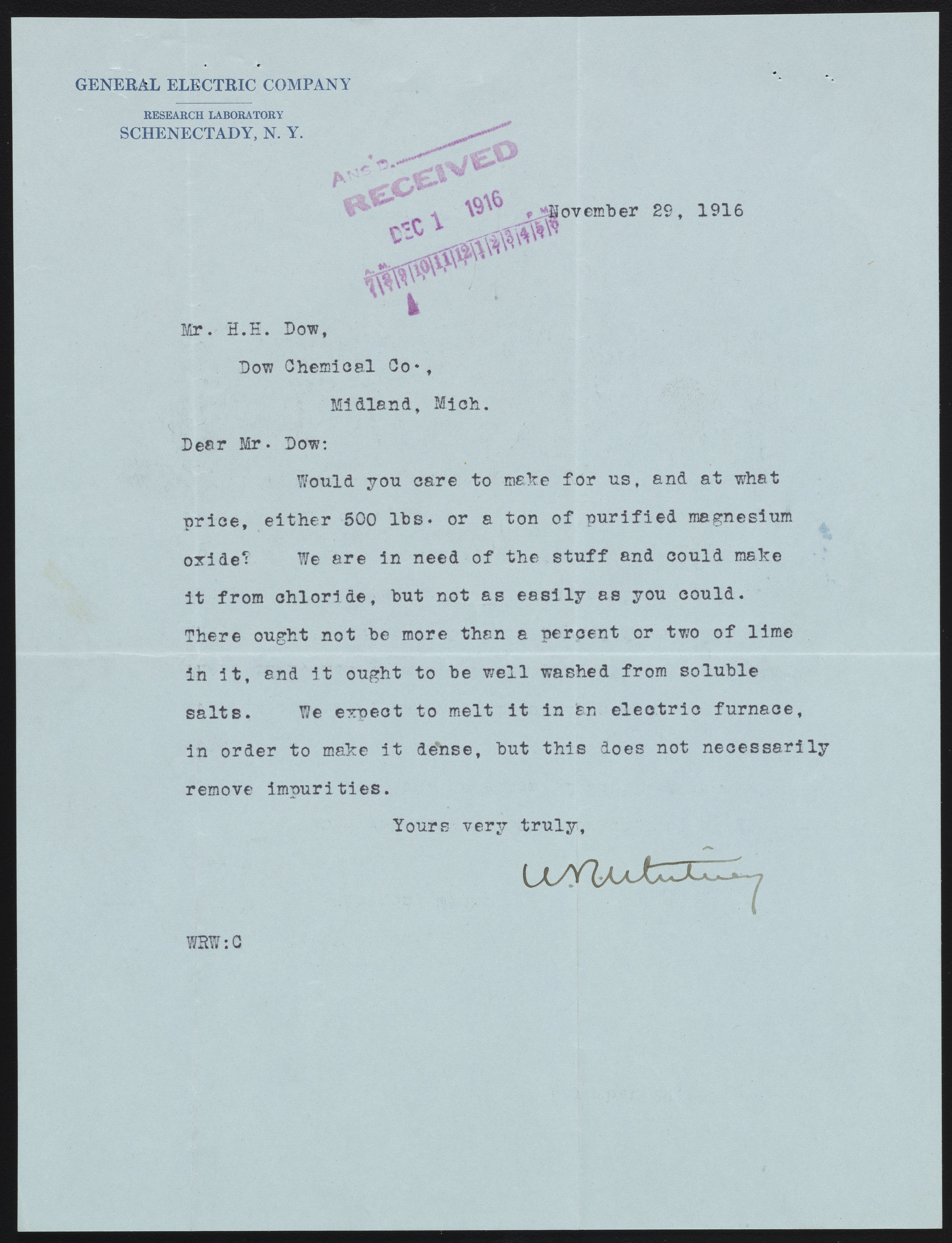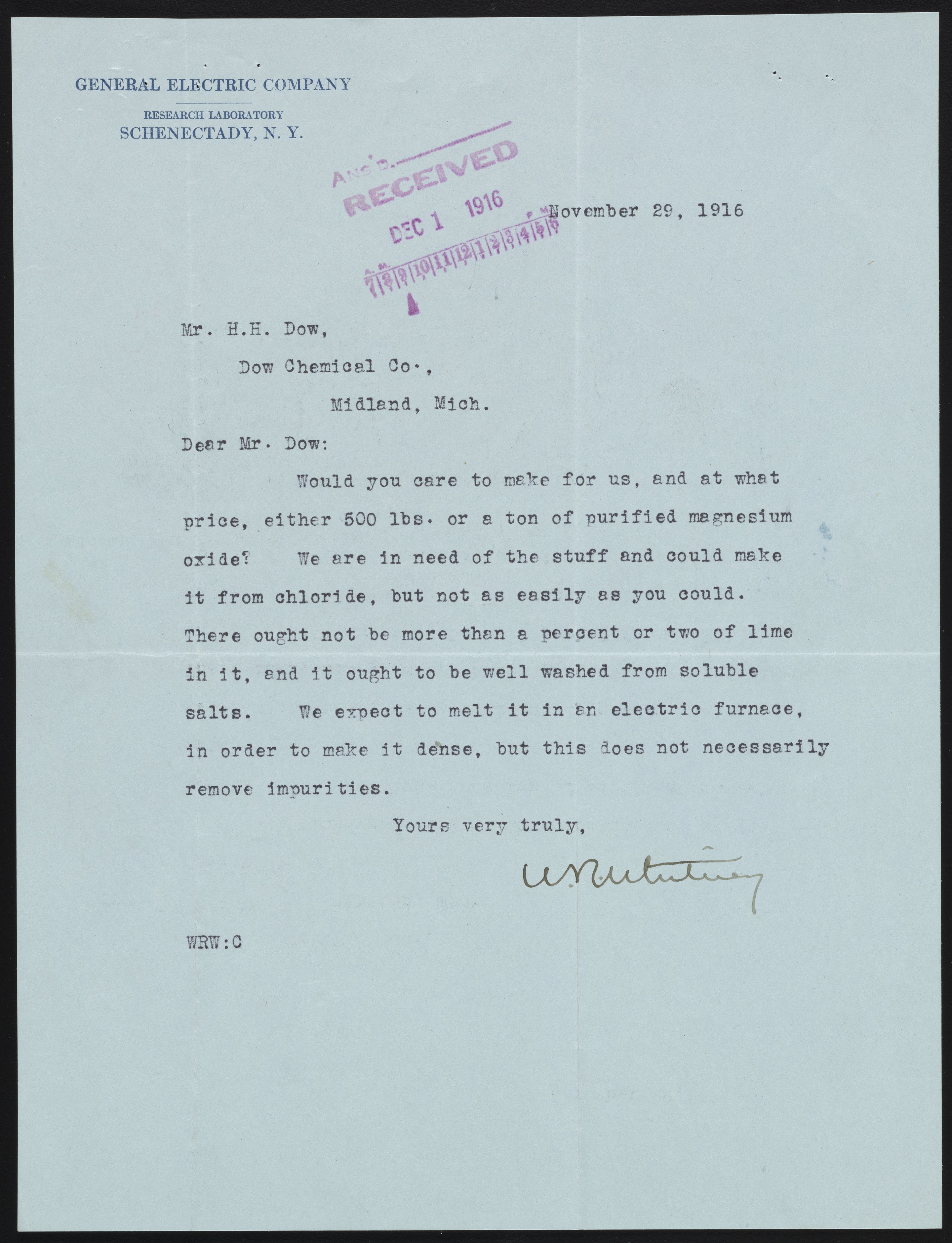 Whitney, Willis Rodney. “Letter from Dr. Willis R. Whitney to Herbert H. Dow, November 29, 1916,” November 29, 1916. Papers of Herbert H. Dow, Box 54, Folder 160062. Science History Institute. Philadelphia. https://digital.sciencehistory.org/works/s4655h566.