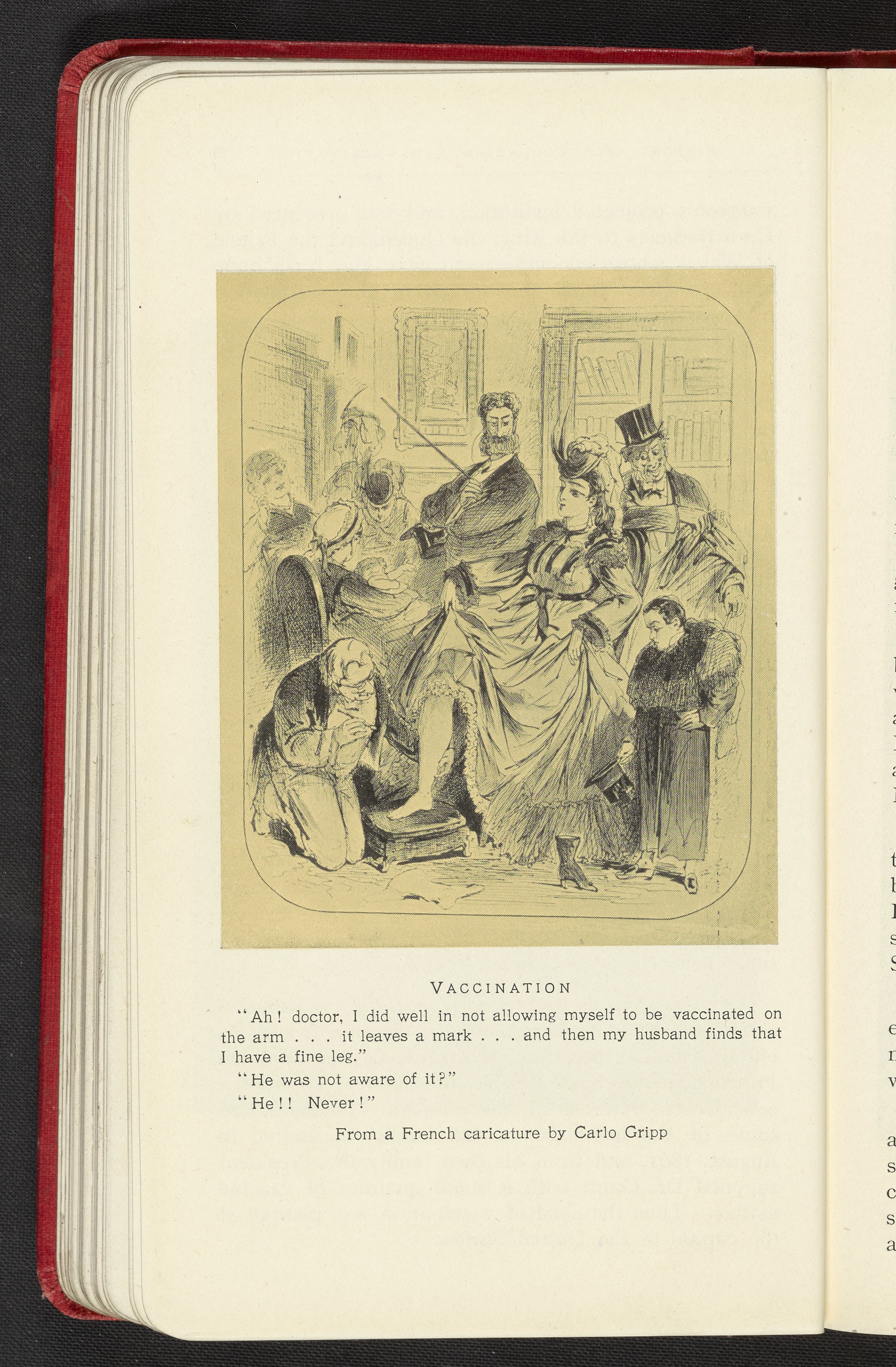 Plate from a French caricature by Carlo Gripp (1826-1900) depicting a woman surrounded by a small group dressed in formal attire. The woman lifts her dress to reveal her shin, which she presents to a kneeling doctor who holds a syringe. The plate supplements the accompanying text's discussion on the spread in popularity of vaccines across Europe and the United States around the turn of the 19th century.