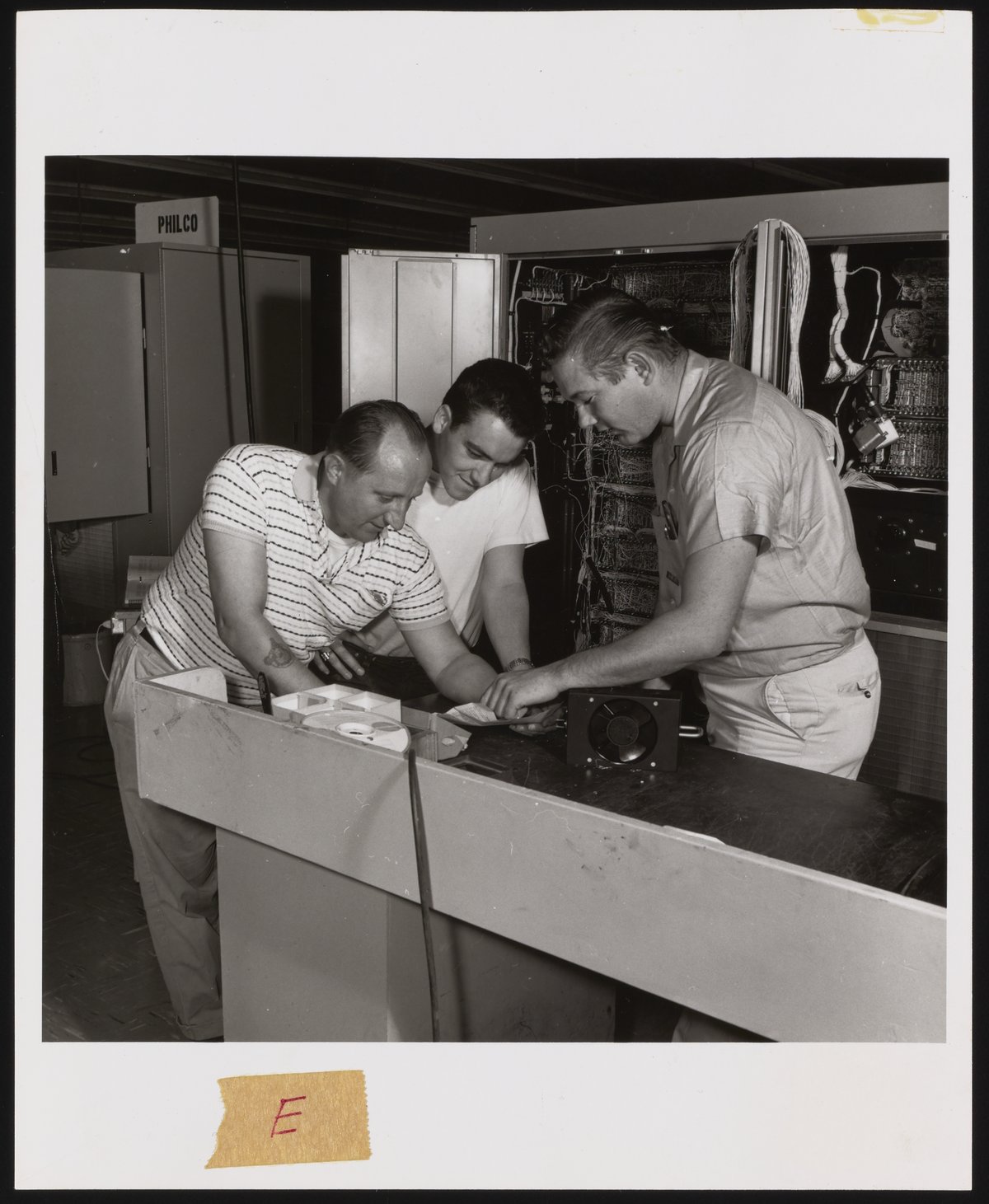 General view of several Beckman Instruments employees inspecting a cooling fan before installation in a PICE system. The employees visible in the photograph are identified as follows (left to right): Hank Harczak; Dan Leonard; and Charlie Marshall.