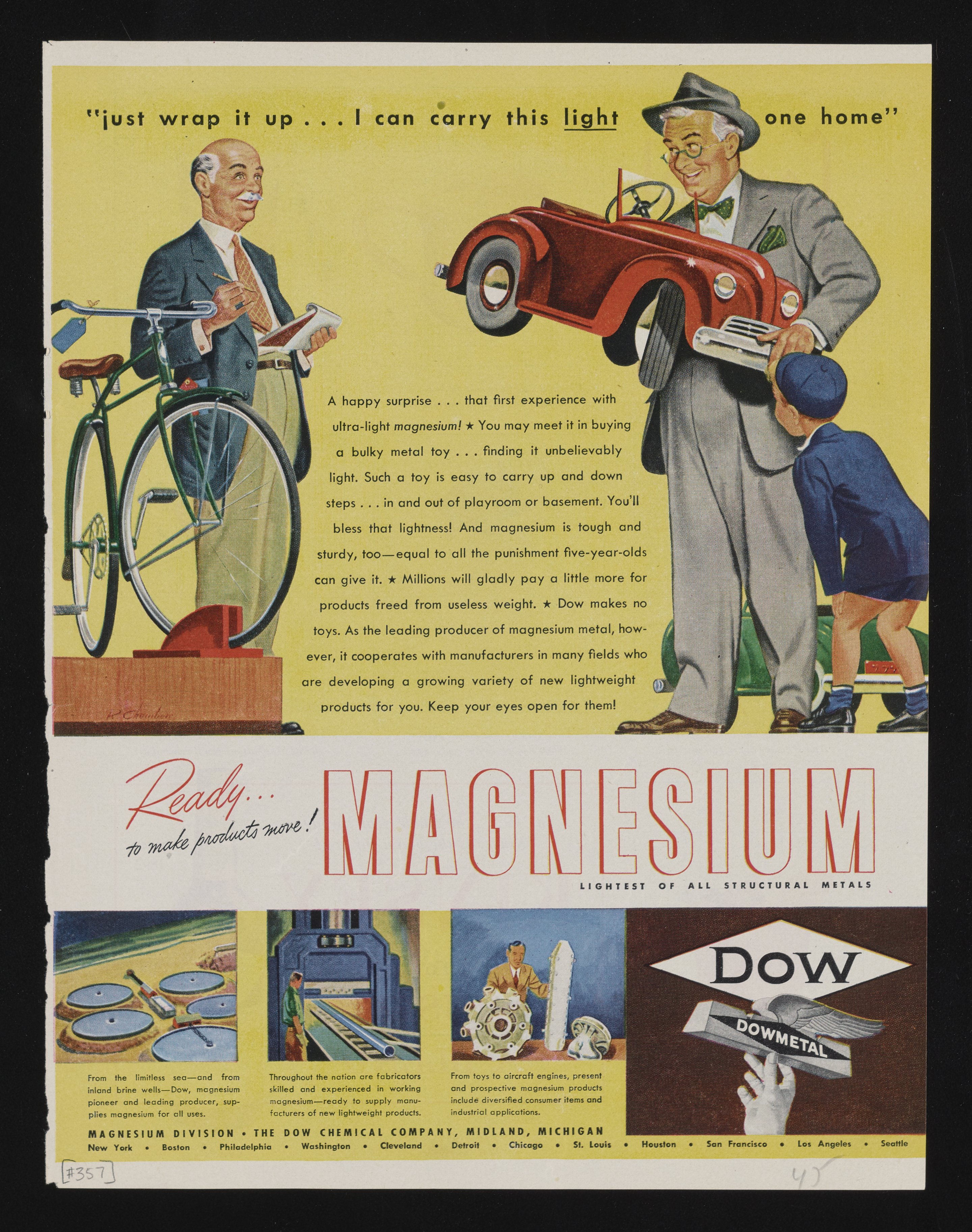 Color print advertisement for Dowmetal, a magnesium alloy manufactured and sold by the Dow Chemical Company. Depicts a grandfather purchasing a ride-on toy car for his grandson. The grandfather remarks on the lightness of the object. The accompanying text describes the use of magnesium to manufacture lightweight and durable toys. Three inset illustrations depict the process of Dow magnesium manufacture, from brine wells and manufacturing plants to the finished alloy taking shape as diversified consumer items. The Dowmetal logo, a hand holding a winged ingot of magnesium, is located in the bottom right of the advertisement.