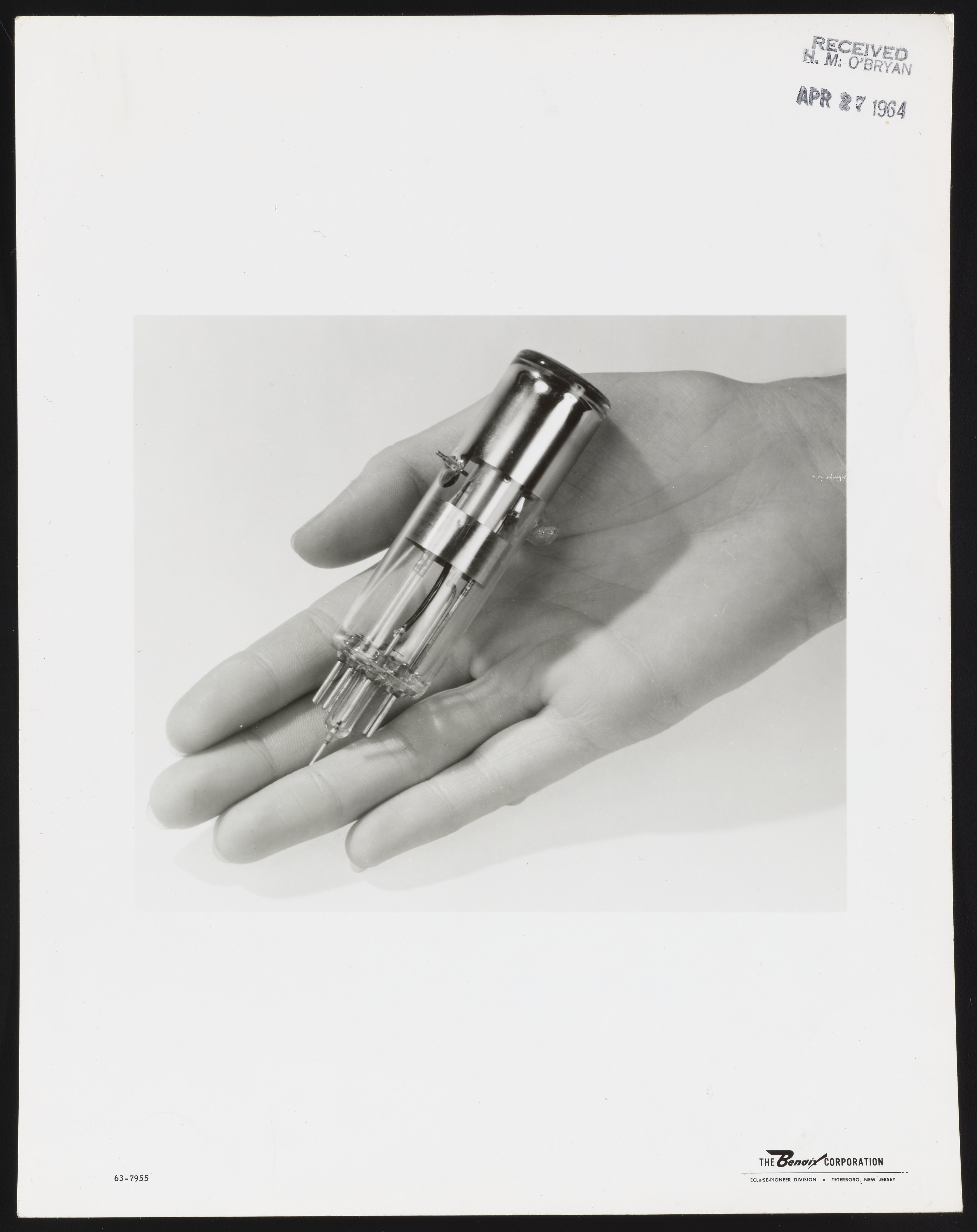 Bendix Corporation. “Bendix Channeltron Electron Multiplier,” April 27, 1964. Photographs from the Bendix Time-of-Flight Mass Spectrometer Collection, Box 3. Science History Institute. Philadelphia. https://digital.sciencehistory.org/works/s7526d05z.