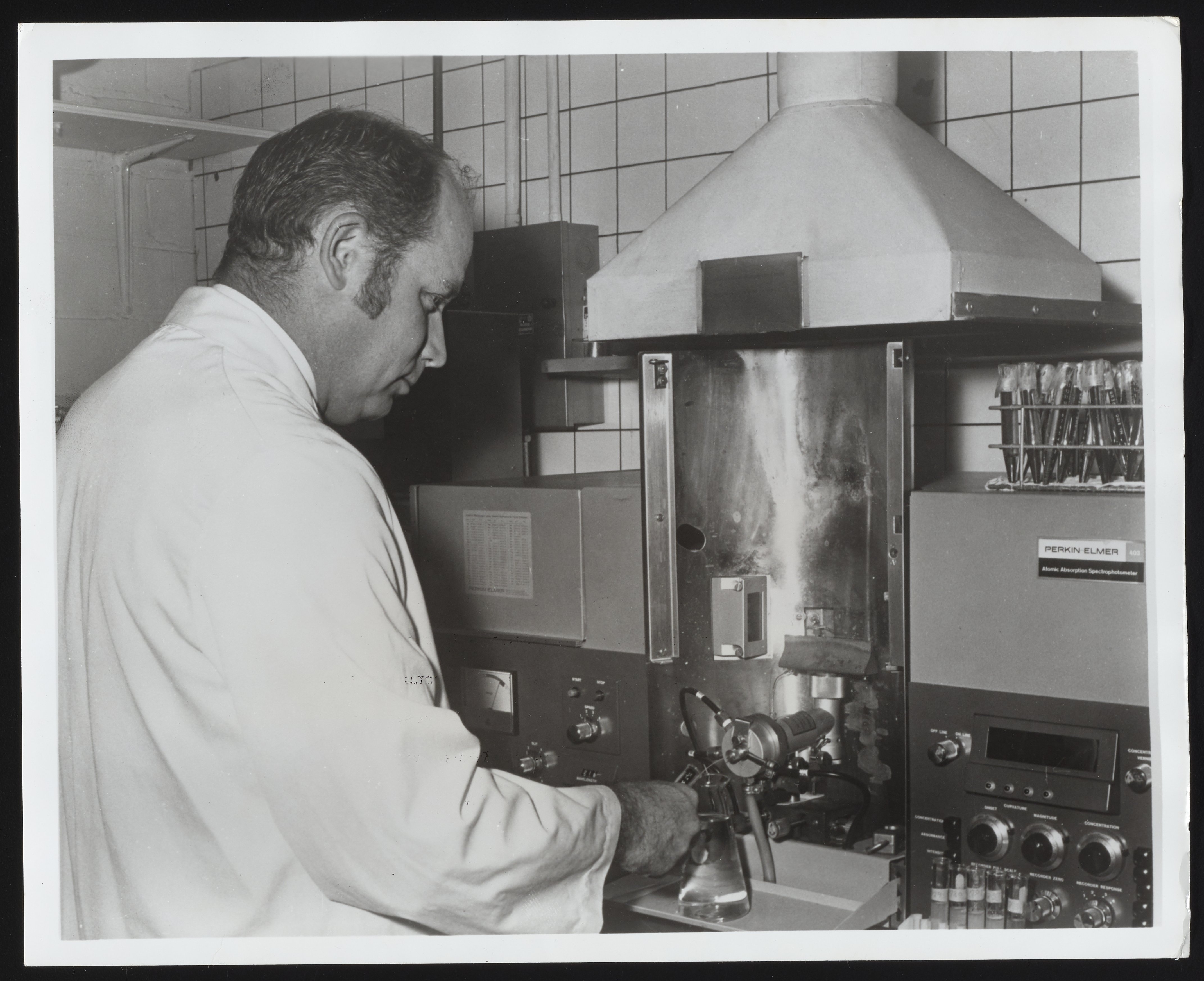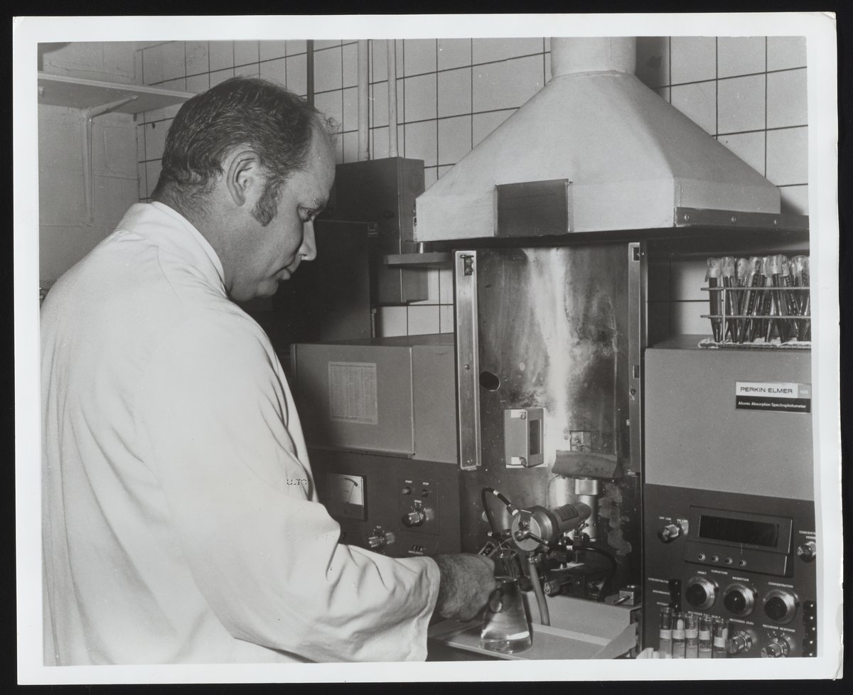 Perkin-Elmer Corporation. “Perkin-Elmer Atomic Absorption Spectrophotometer in Use at National Institute for Occupational Safety and Health Laboratory,” 1970–1979. Photographs from the Perkin-Elmer-Applera Collection, Box 4. Science History Institute. Philadelphia. https://digital.sciencehistory.org/works/s7526d334.