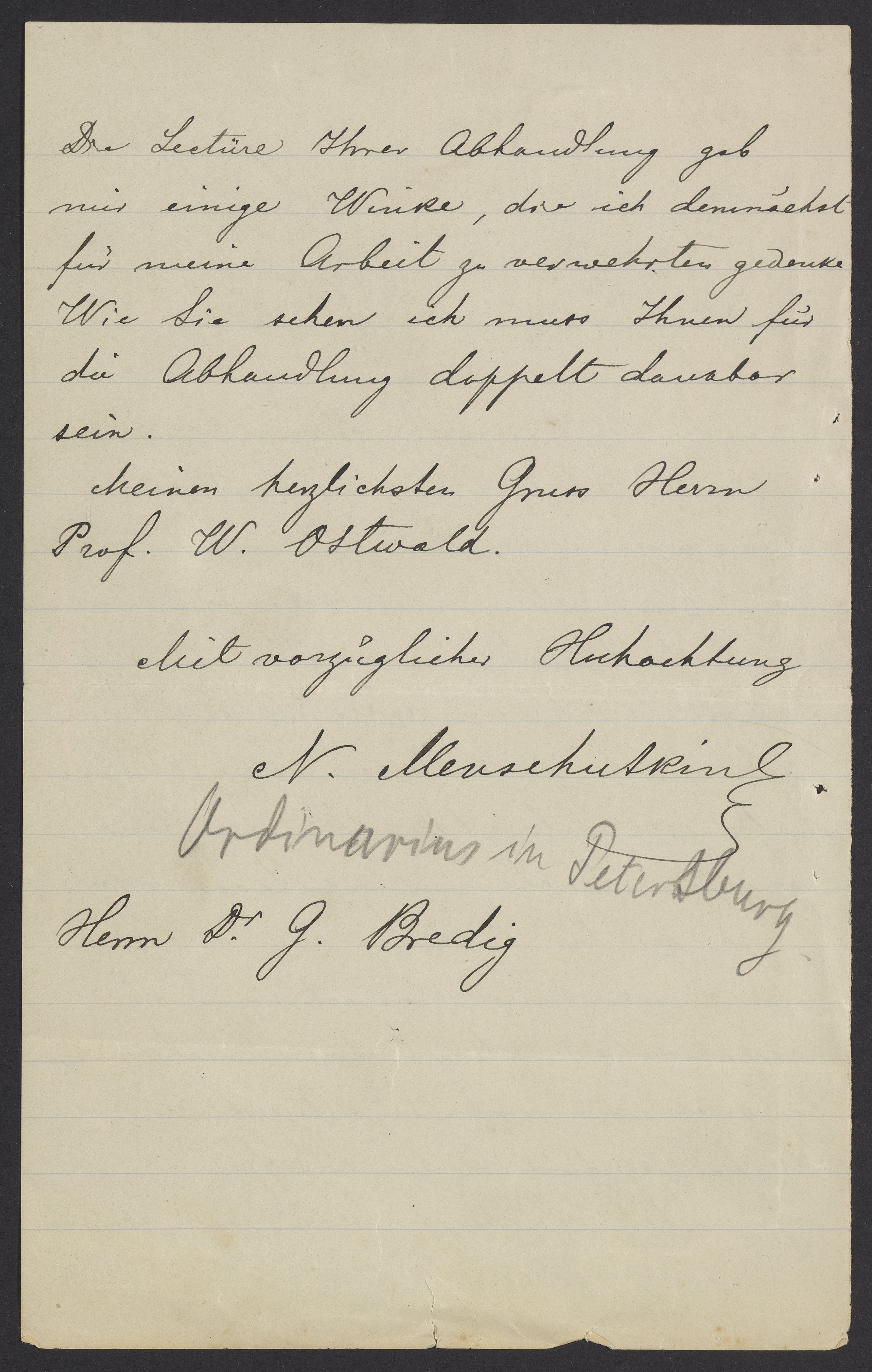Meinen herzlichen Gruss Hernn Prof. W. Ostwald.