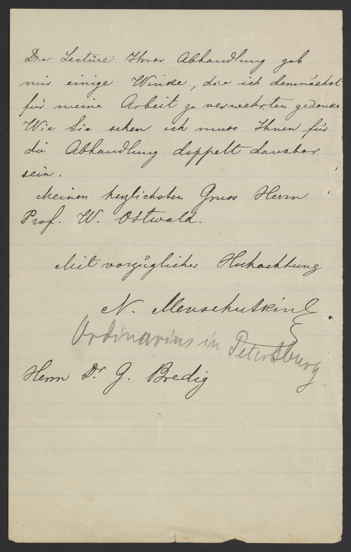 [Bredig’s hand: Ordinarius in Petersburg]