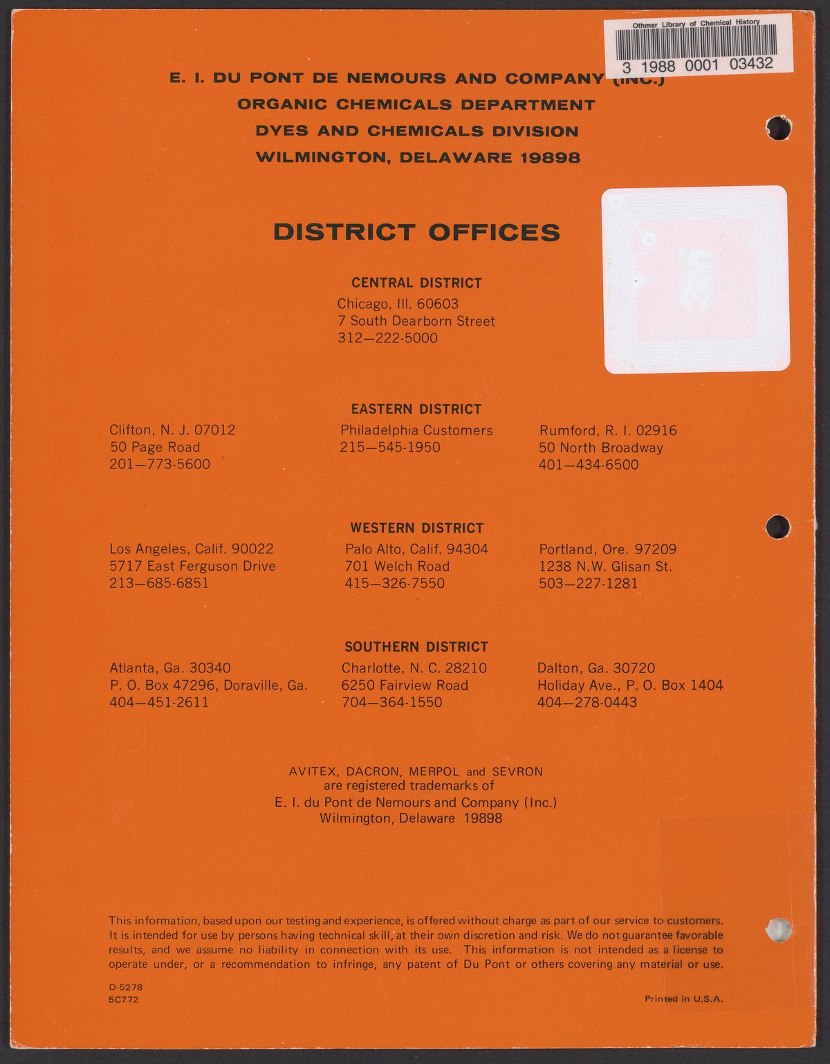 E.I. du Pont de Nemours & Company. Organic Chemicals Department. "Sevron" Cationic Dyes on "Dacron" Type 801 Polyester Fiber. Wilmington, Delaware: E.I. du Pont de Nemours & Company, 1972. https://digital.sciencehistory.org/works/s8fi8zt.