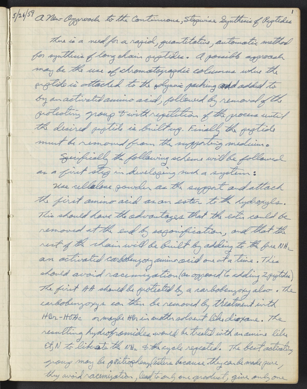 Merrifield, Bruce. “Robert Bruce Merrifield Notebook,” 1959–1960. Science History Institute. Philadelphia. https://digital.sciencehistory.org/works/sb3978325.