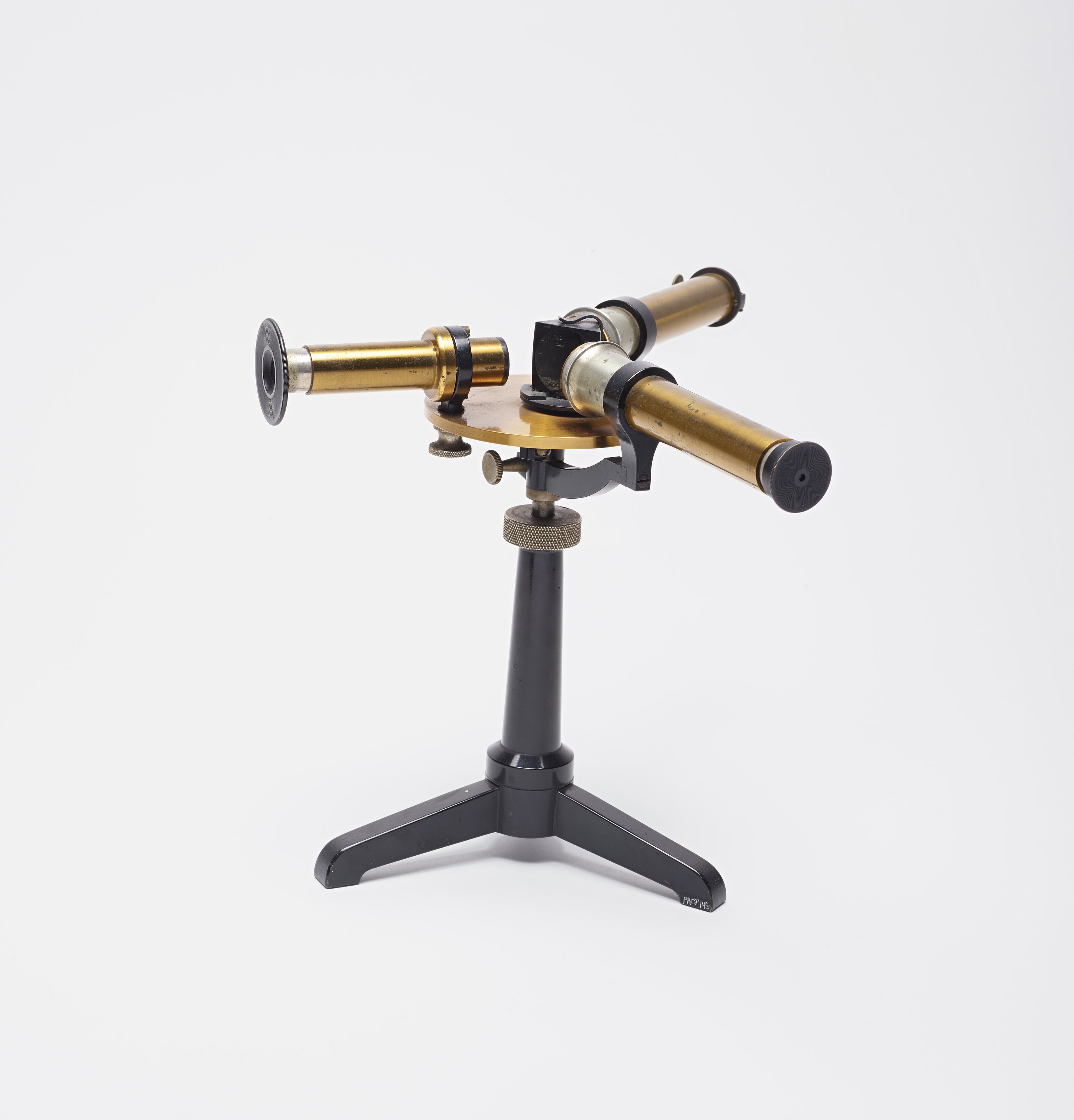 Small JPG1200 x 1251px — 69.9 KBLarge JPG2880 x 3001px — 232 KBFull-sized JPG5476 x 5707px — 669 KBOriginal fileTIFF — 5476 x 5707px — 89.4 MBSpectroscope is in the style of the original Bunsen-Kirchhoff design. Triangular glass prism sits on a round, brass dias and is held in place by a metal arm attached to the dias; prism is coated in black paint with only a round section of glass revealed on two sides; prism dias supported by a single pole with three feet at the base; three cylindrical tubes extend out of the prism holder; first tube is a telescope for viewing and attached below the prism dias; the second tube is the scale telescope and is attached to the prism dias; the final tube is the collimator which allows light into the system, a slit at the end of the tube can be opened and closed using a screw mechanism.