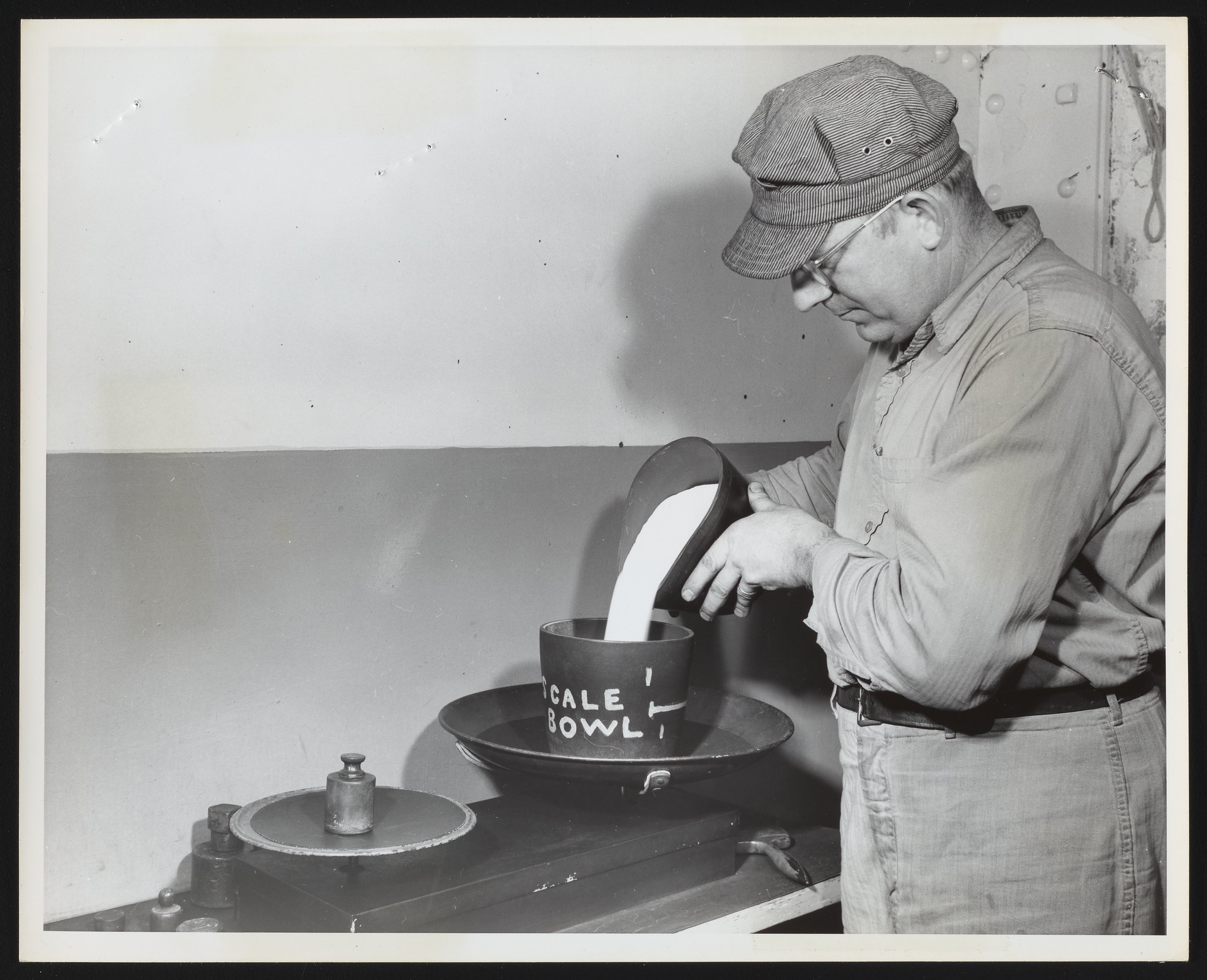 Hercules Incorporated. “Sylvester Demskie Weighing Diazo and Potassium Chlorate at Hercules Port Ewen Plant,” 1955. Photographs from the Records & Ephemera of Hercules Incorporated, Box 2, Folder 37. Science History Institute. Philadelphia. https://digital.sciencehistory.org/works/sb3978792.
