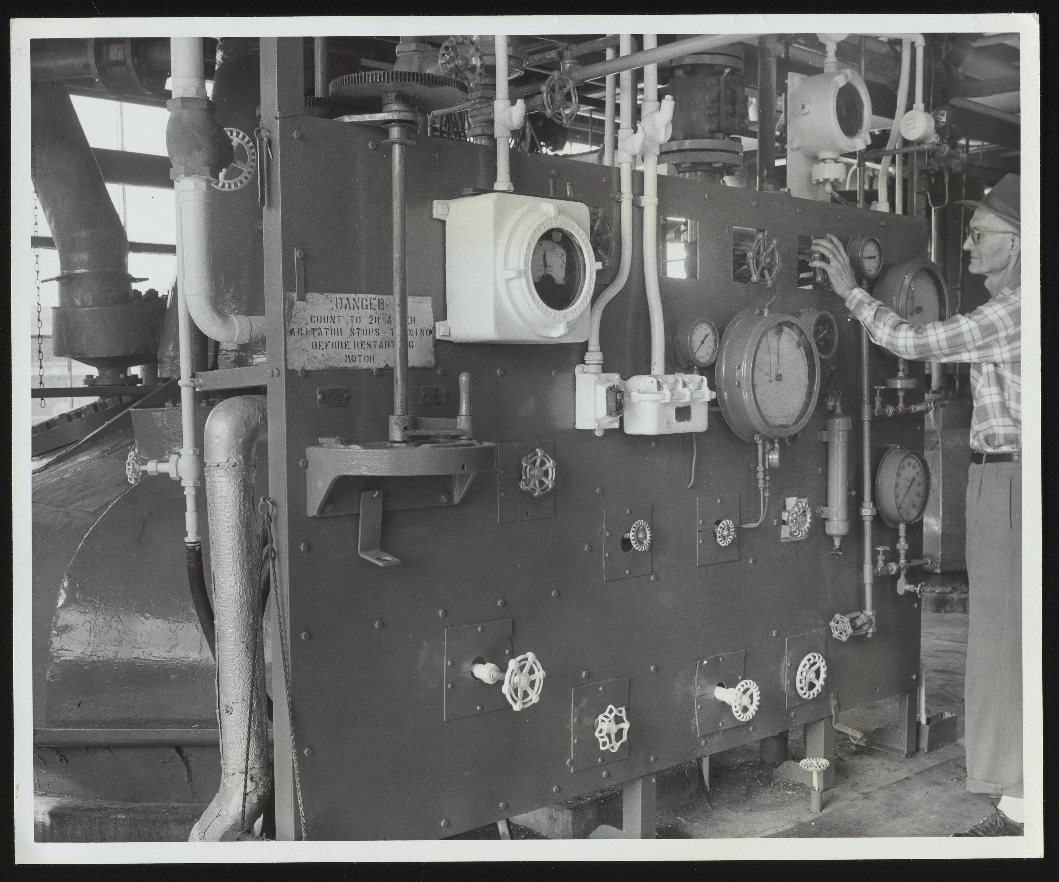 Employee operating autoclave control panel at Hercules Hopewell plant