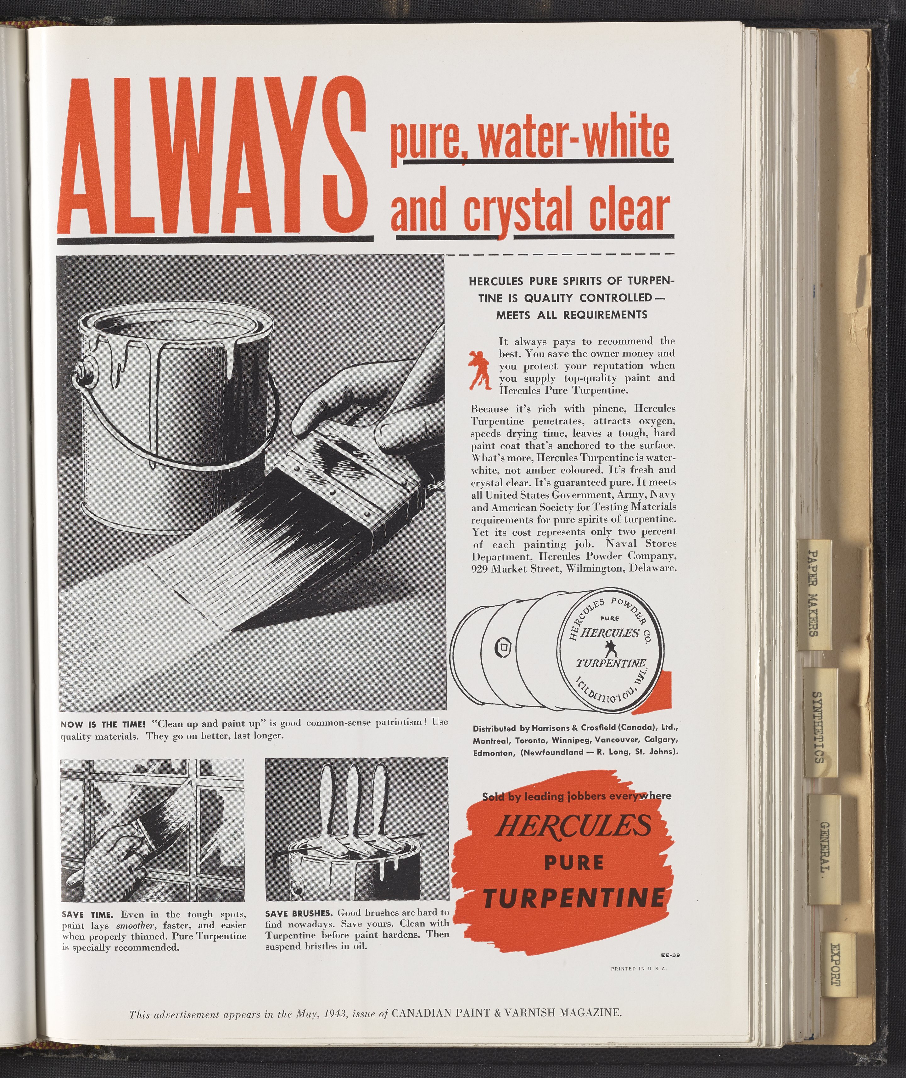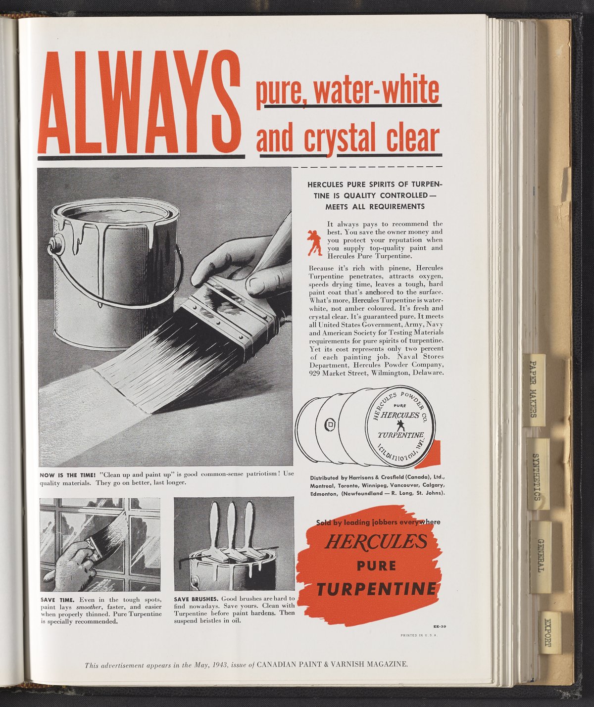 Hercules Incorporated. “Always Pure, Water-White and Crystal Clear.” 1943 Hercules Advertisements, 1943. Records of Hercules Incorporated, Volume 1943. Science History Institute. Philadelphia. https://digital.sciencehistory.org/works/sb397905g.