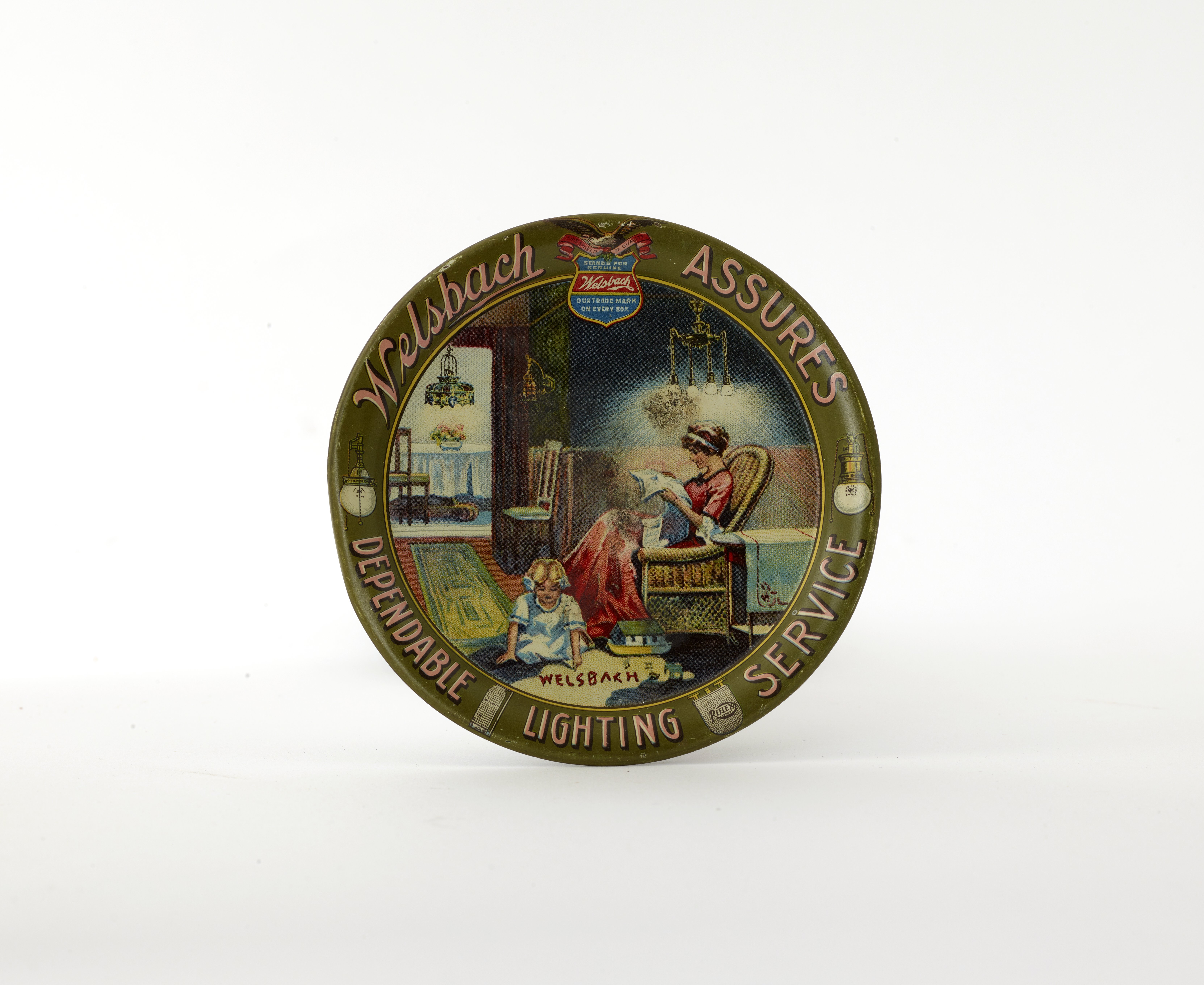 A single-sided tin lithograph tip tray. This circular green plate features a scene of a seated woman reading a newspaper with a child playing at her feet. The child has spelled out "WELSBACH" using toys on the floor. A ceiling lamp shines from above the woman's head. Around the border of the tray is printed "Welsbach Assures Dependable Lighting Service" with two lamps depicted on opposite sides. A seal at the top reads "Welsbach/Our Trademark/On Every Box".