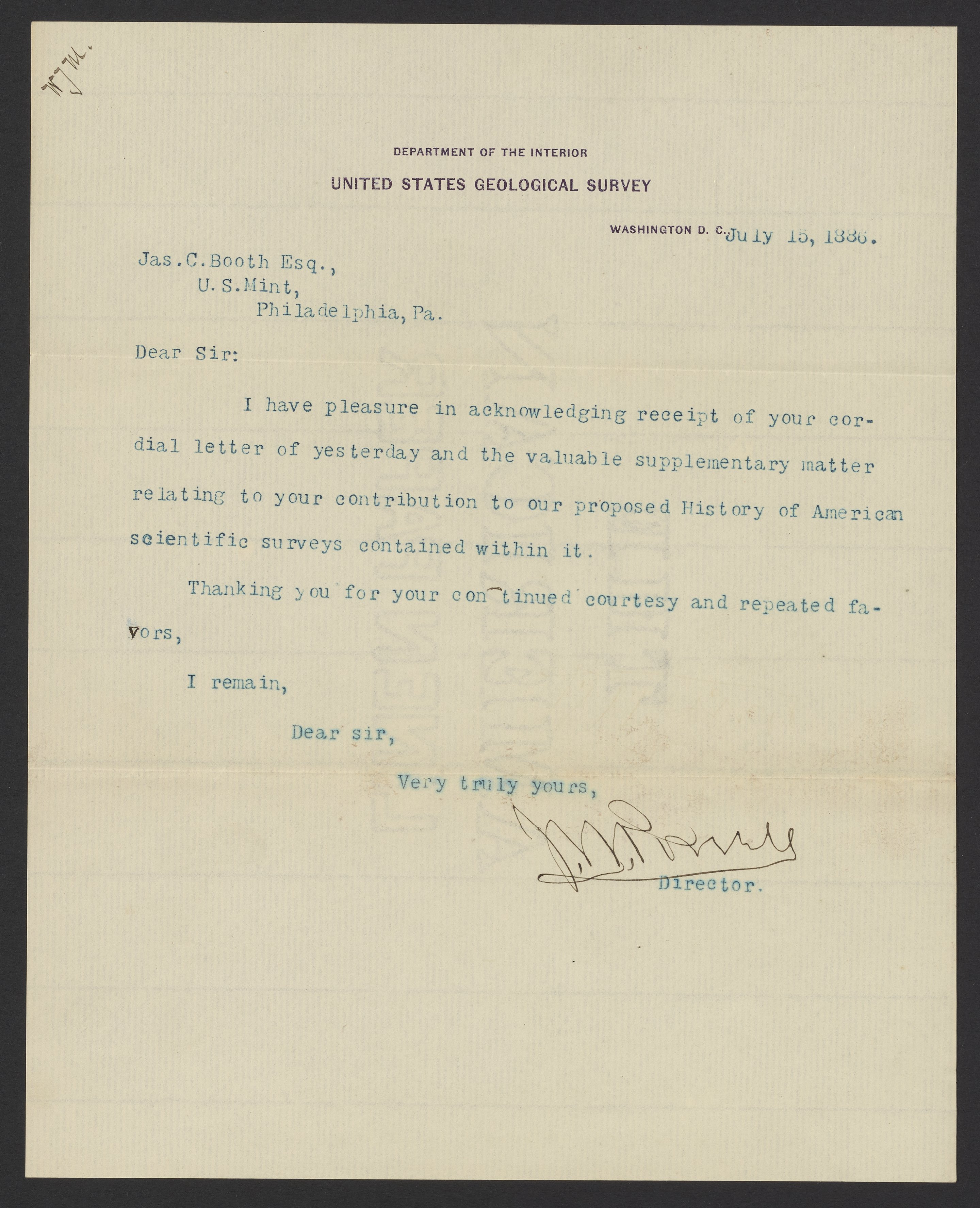 Powell, John Wesley. “Letter from John Wesley Powell to James Curtis Booth, July 15, 1886,” July 15, 1886. Papers of James Curtis Booth, Box 2, Folder 9. Science History Institute. Philadelphia. https://digital.sciencehistory.org/works/se4gw5b.