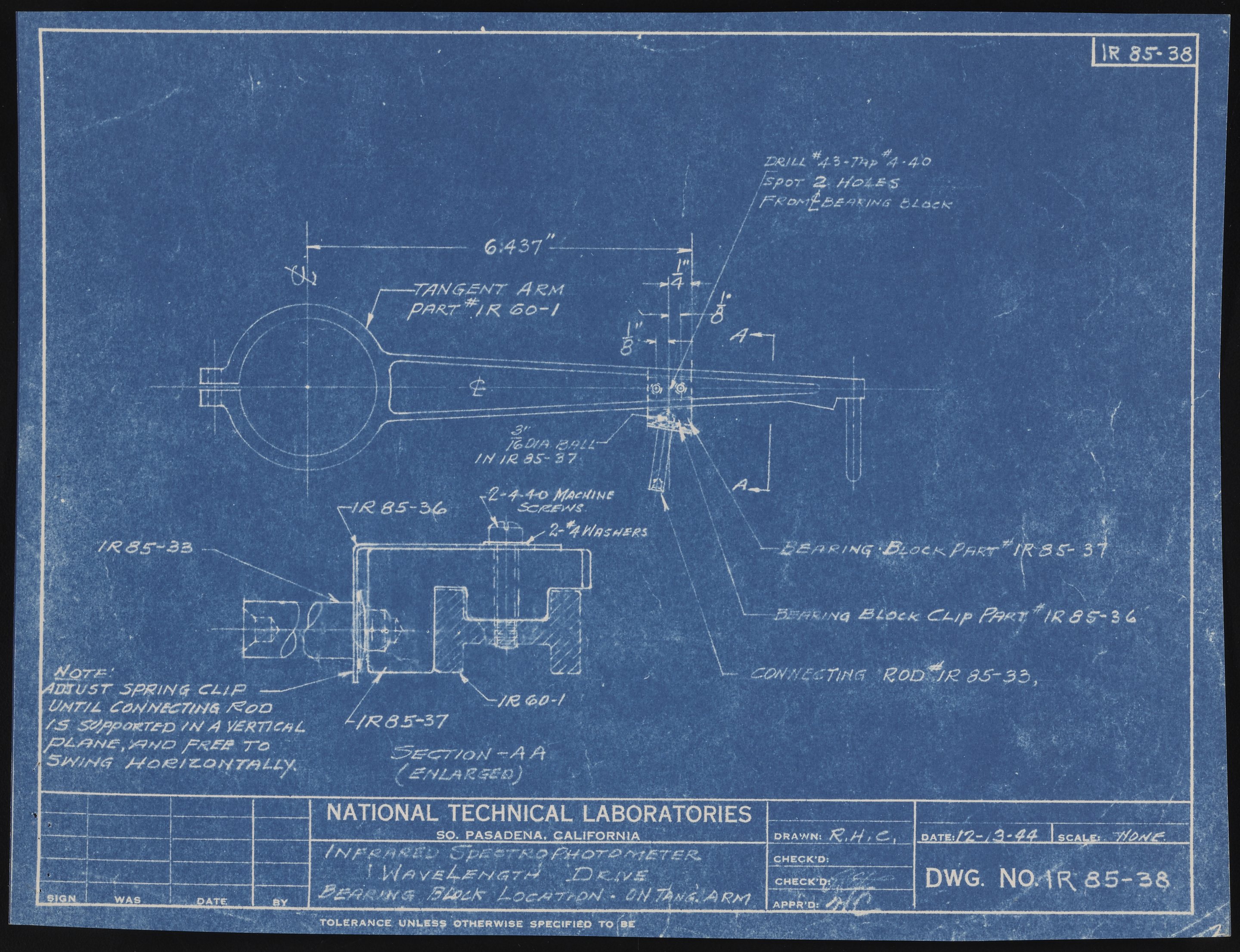 Beckman Instruments, Inc. “Beckman IR Spectrophotometer Wavelength Drive Bearing Block Location,” December 13, 1944. Beckman Historical Collection, Box 18, Folder 9. Science History Institute. Philadelphia. https://digital.sciencehistory.org/works/sf268512x.