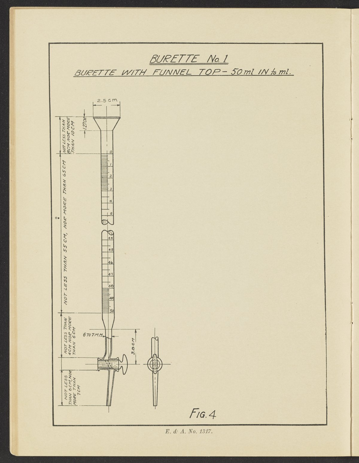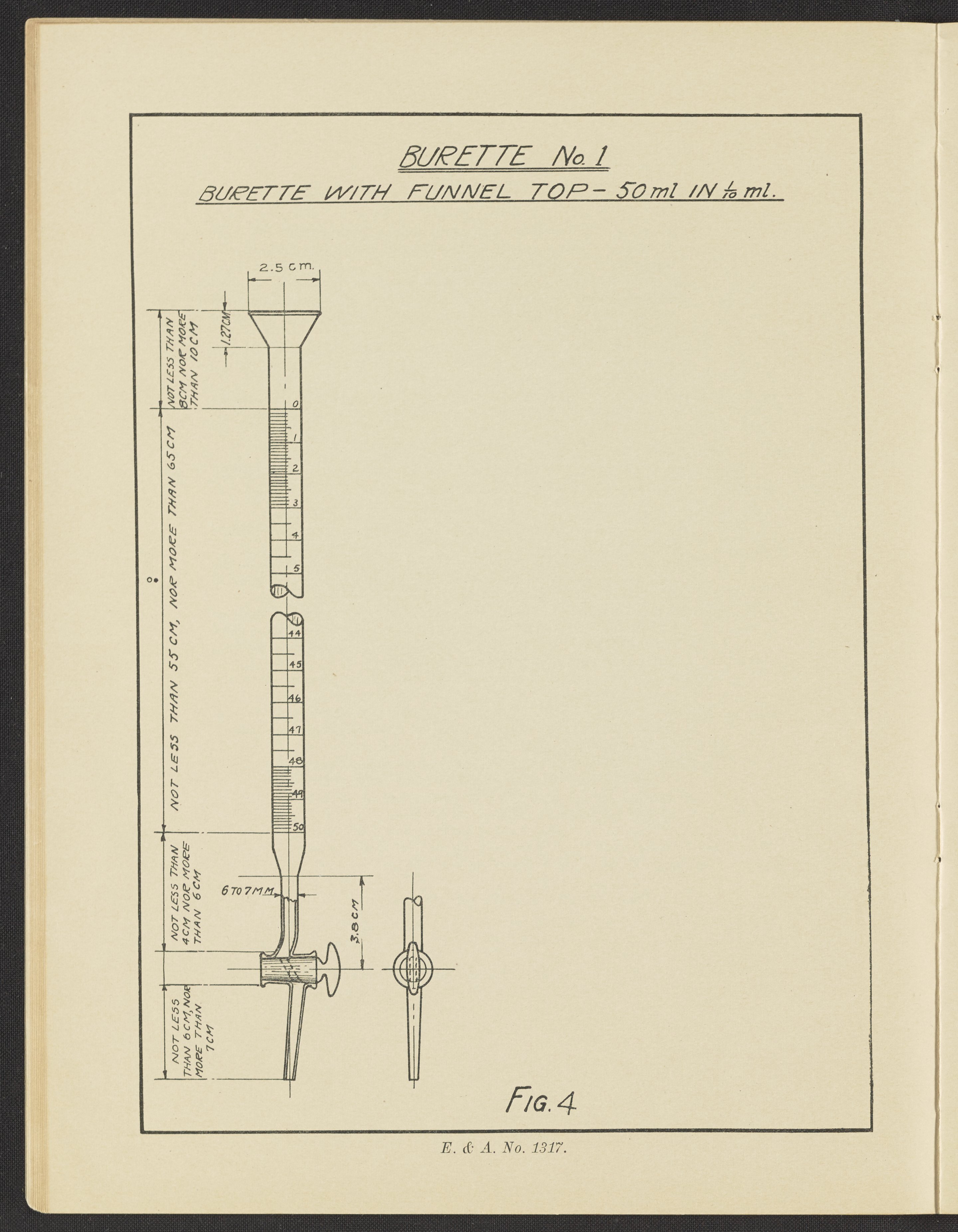 “Specifications for Burette No. 1.” Standard Laboratory Apparatus Adopted by the Manufacturing Chemists Association of the United States Part 1. New York (State): Eimer & Amend, 1922. https://digital.sciencehistory.org/works/sf268514g.