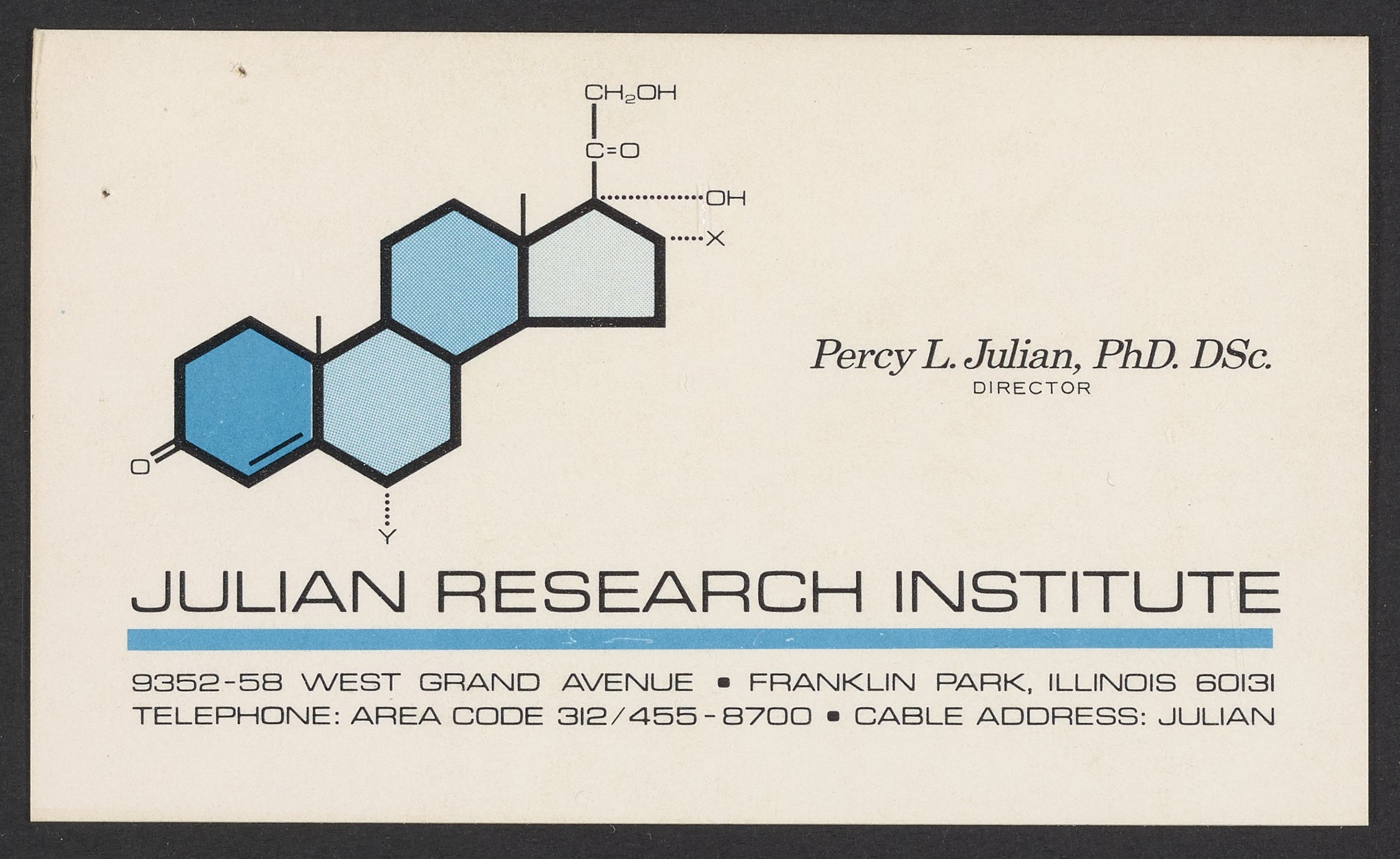 Business card of Percy Lavon Julian (1899-1975), African American research chemist and pioneer in the chemical synthesis of medicinal drugs from plants. This card reflects Julian's position as the Director of the Julian Research Institute, a nonprofit research organization founded by Julian.