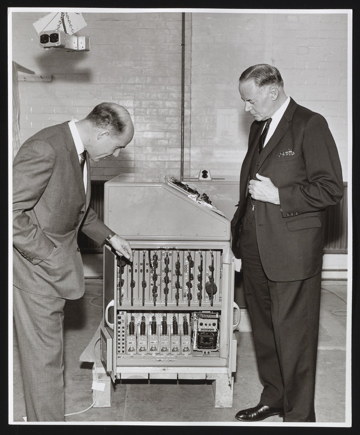 General view of Perkin-Elmer Corporation co-founder and President Richard Scott Perkin (right) and an unidentified individual examining a portion of the interior of a Perkin-Elmer instrument.