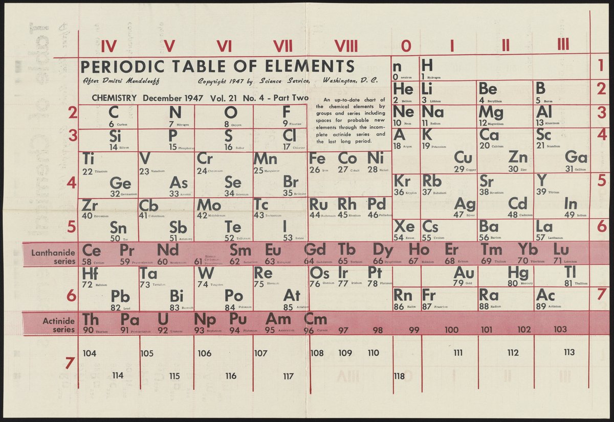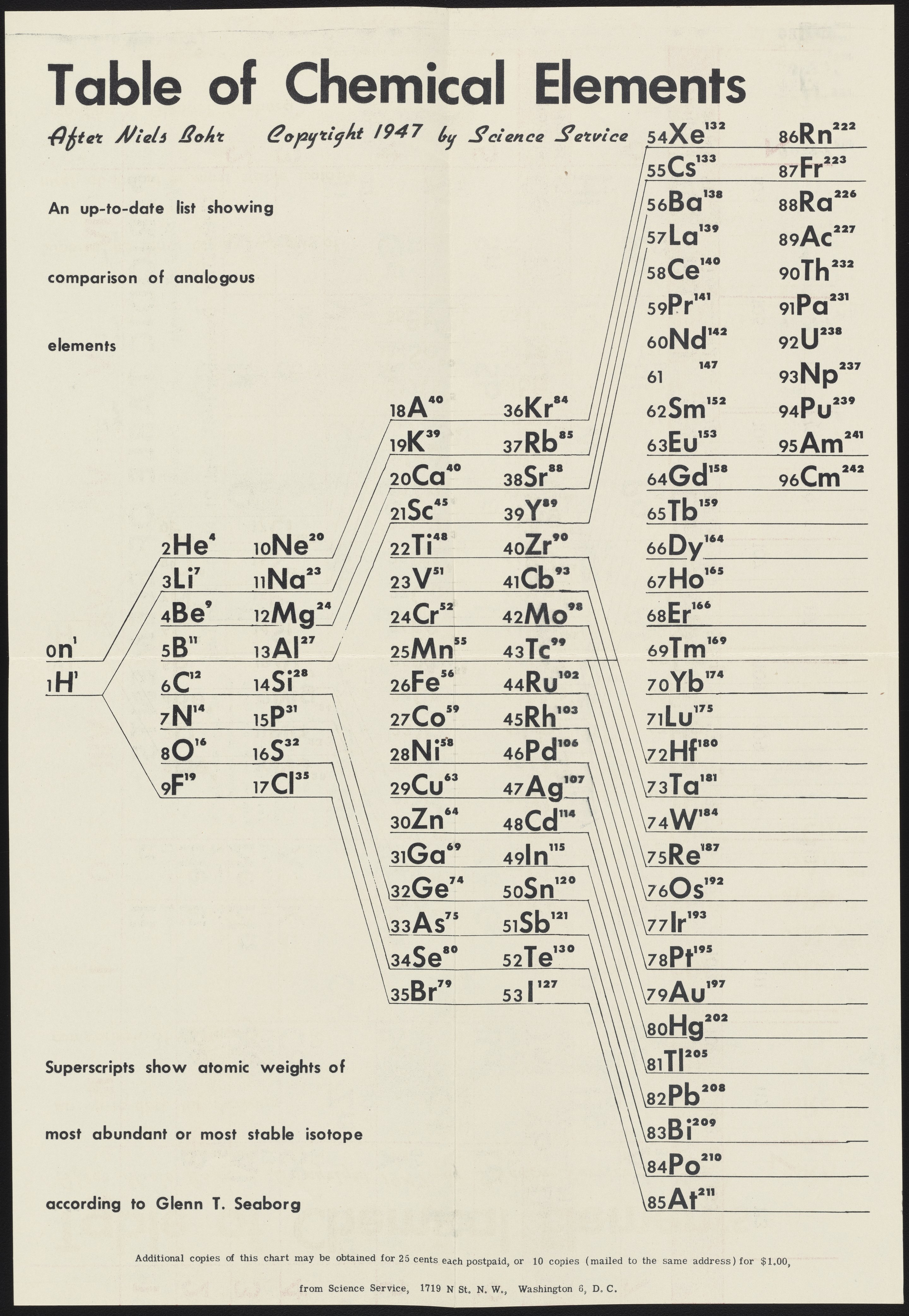 “Periodic Tables by Science Service.” Washington (D.C.): Science Service, 1947. Periodic Tables Collection, Box FC-5, Folder Periodic Tables (Assorted). Science History Institute. Philadelphia. https://digital.sciencehistory.org/works/sj139273w.