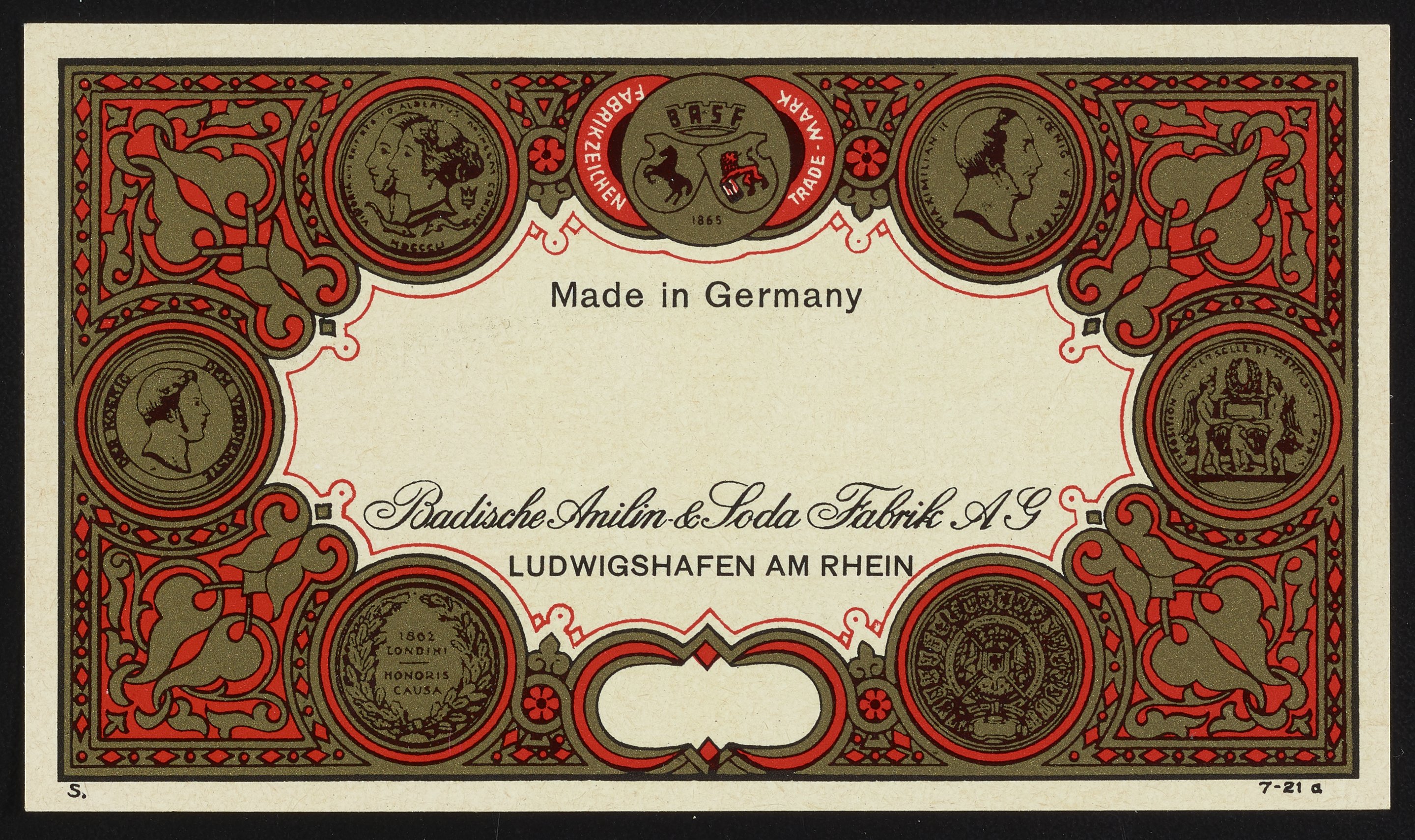 “Badische Anilin & Soda-Fabrik Dye Label.” Dye transfer prints. Ludwigshafen am Rhein, Germany: Badische Anilin- & Soda-Fabrik, circa 1900. Science History Institute. Philadelphia. https://digital.sciencehistory.org/works/sj139301v.