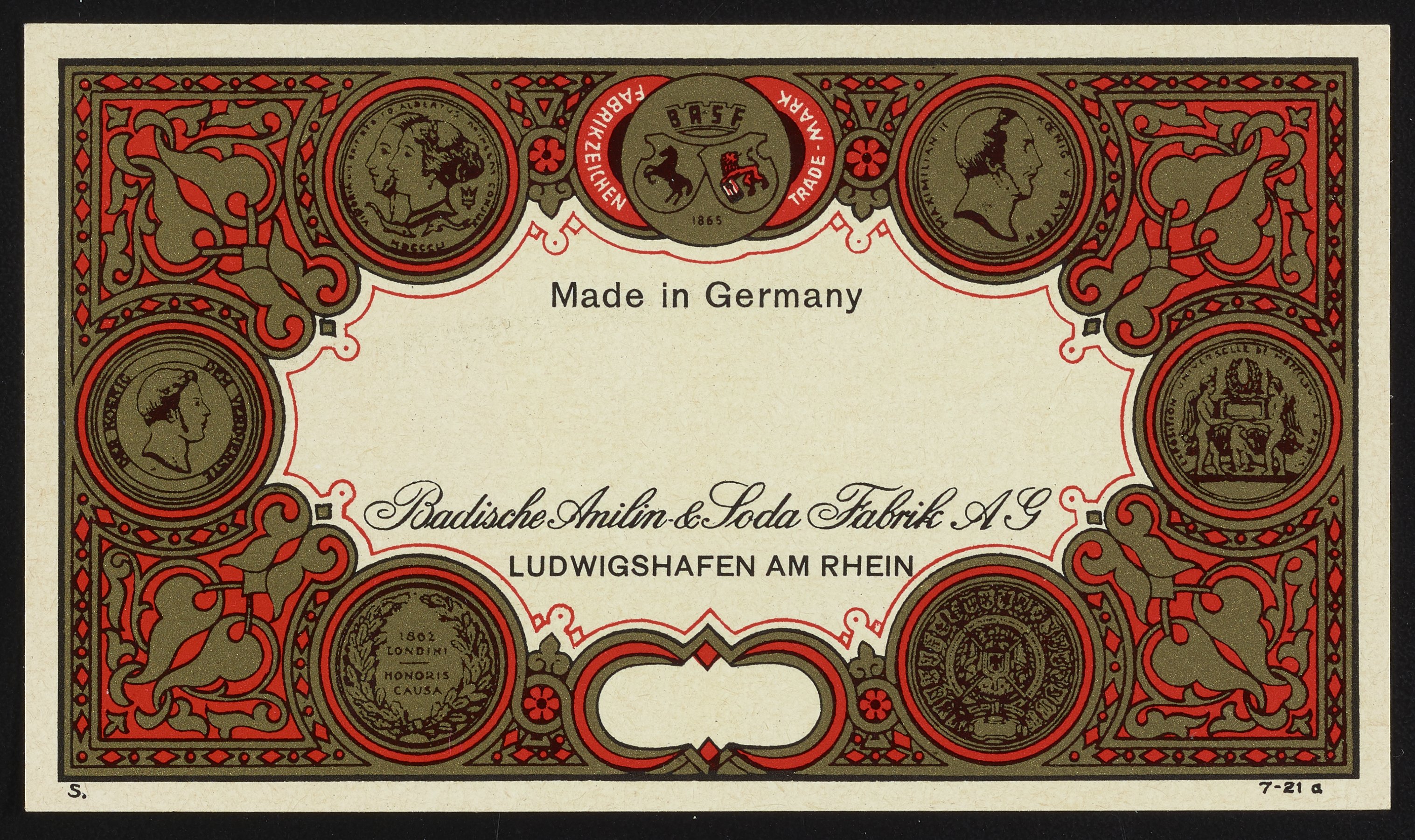 Founded in 1865, Badische Anilin & Soda-Fabrik (BASF) was once the largest chemical factory in the world. Based in Ludwigshafen, Germany, the company first concentrated on the manufacture of synthetic dyestuffs. Key breakthroughs came in the form of the industrial production of synthetic indigo (1897) and the discovery of the indanthrene dyes (1901). Aniline dyes determined much of the firm's business. The company primarily advertised by submitting its products for awards at regional and international industrial trade fairs, especially world's fairs.