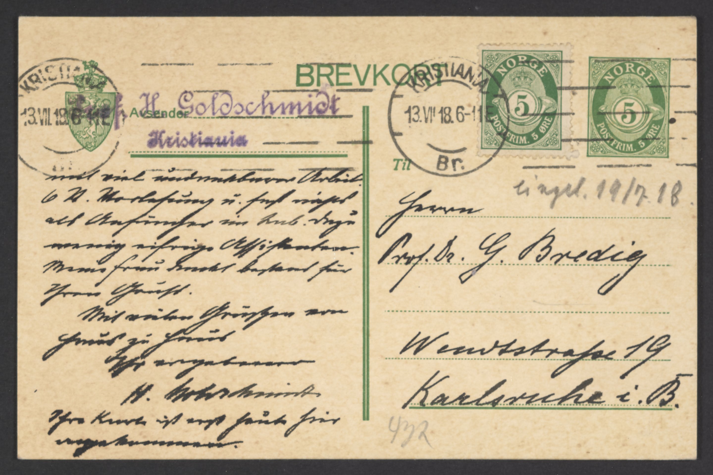Postcard from Heinrich J. Goldschmidt to Georg Bredig