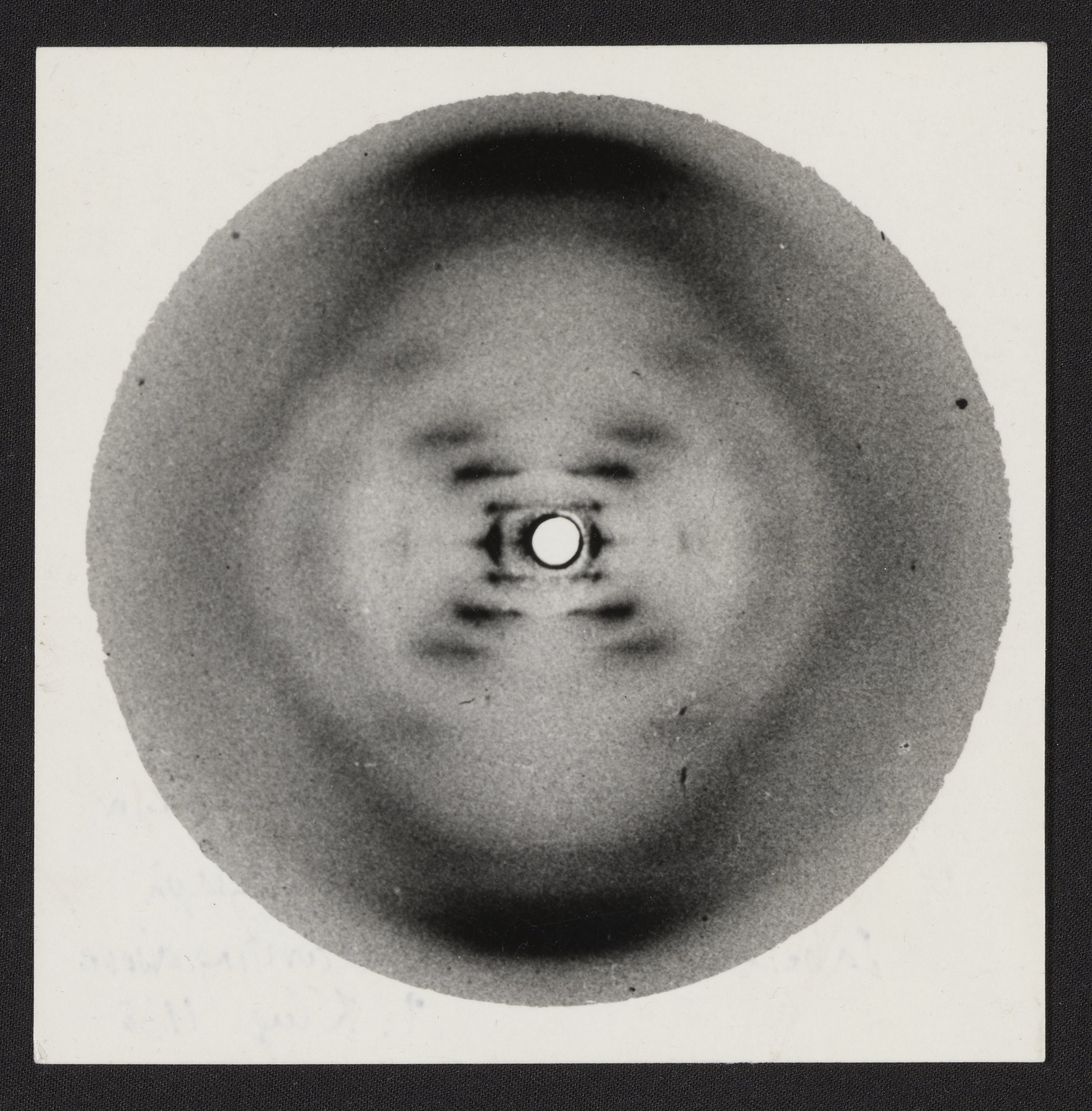 Small JPG1200 x 1221px — 228 KBFull-sized JPG2687 x 2733px — 887 KBOriginal fileTIFF — 2687 x 2733px — 21.0 MBPhotographic print of a DNA X-ray diffraction pattern known as Photograph 51 with annotations by Rosalind Franklin (1920-1958) and Aaron Klug (1926-2018). The original image was made by Franklin and her student Raymond Gosling (1926-2015) at King’s College London in 1952 and it was published in their 1953 Nature article “Molecular Configuration in Sodium Thymonucleate” alongside the article in which James Watson (1928-2025) and Francis Crick (1916-2004) proposed the double-helix structure of DNA. The photo contains three annotations on the reverse. An unsigned pen inscription reads “NaDNA ‘Structure B.’” Another pen inscription reads “Original print by Rosalind Franklin of the famous B form photograph. Labelled in her handwriting above. A. Klug 1968.” A pencil annotation reads “867.”