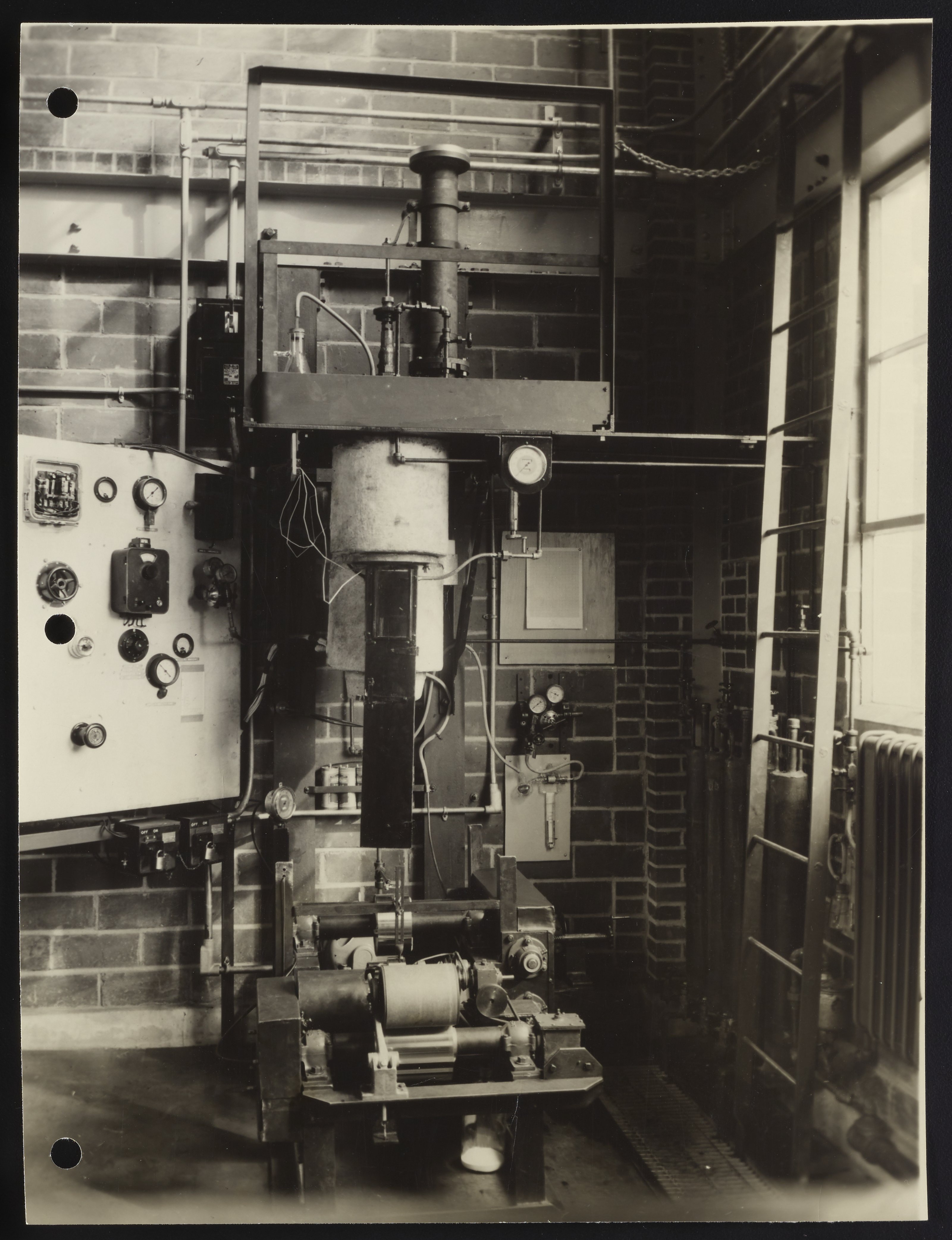 General view of the third continuous spinning machine used during the early stages of nylon production and research at the DuPont Experimental Station in Wilmington, Delaware. This machine became the prototype for the continuous spinning machine used at DuPont's first nylon pilot plant and was notably taken to Europe in July 1938 by Don Hull to demonstrate the nylon process. During production, nylon chips were fed into the pipe hopper at the top of the machine and then dropped onto a hot grid, where they melted. The melt subsequently flowed through a booster pump designed to help eliminate gas bubbles and ultimately was extruded through a spinneret to form filaments. Finally, the filaments were processed through a steam chimney and wound onto a bobbin at the rate of 1,000 feet per minute.