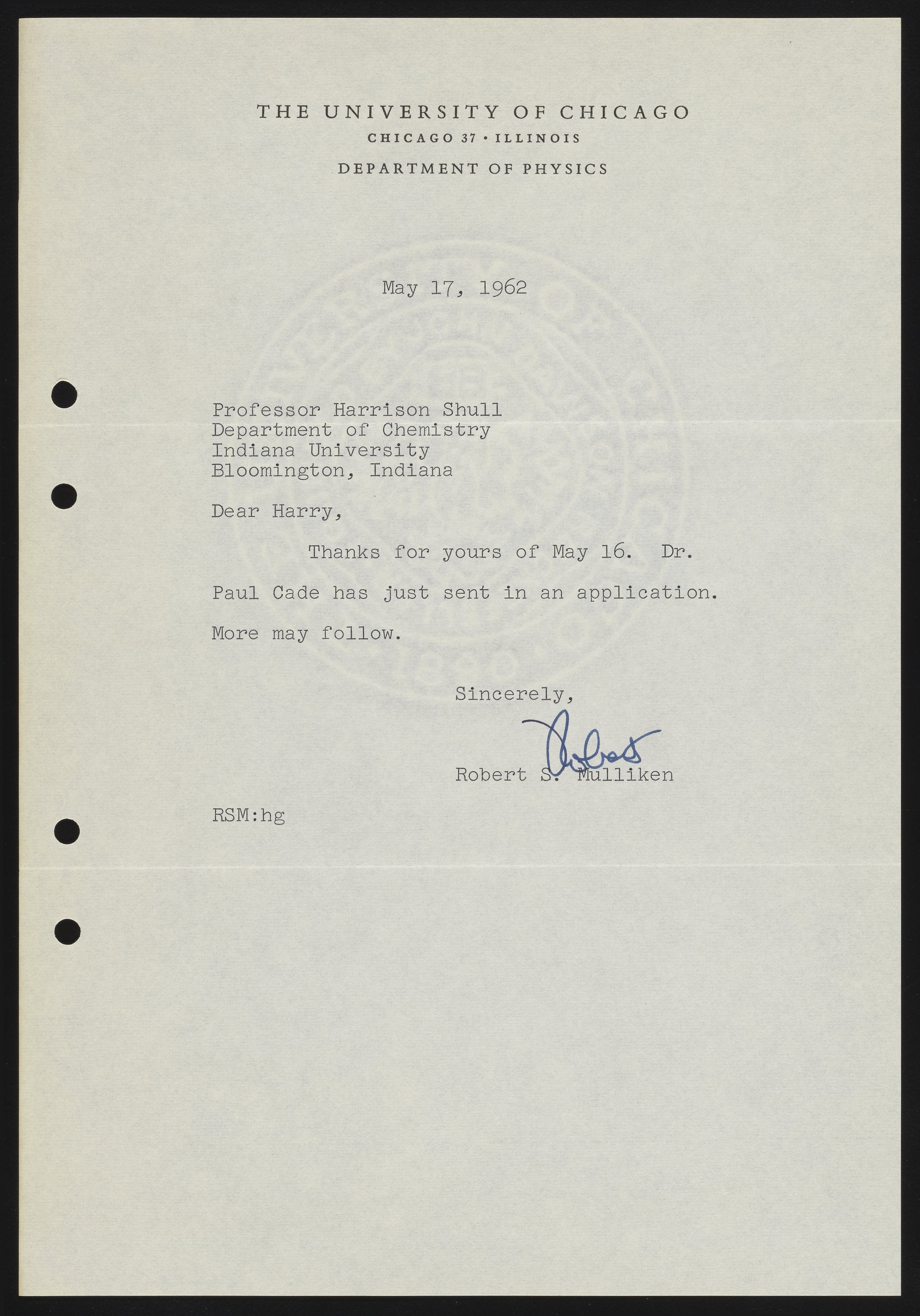 Letter from Robert S. Mulliken to Harrison Shull, 1962