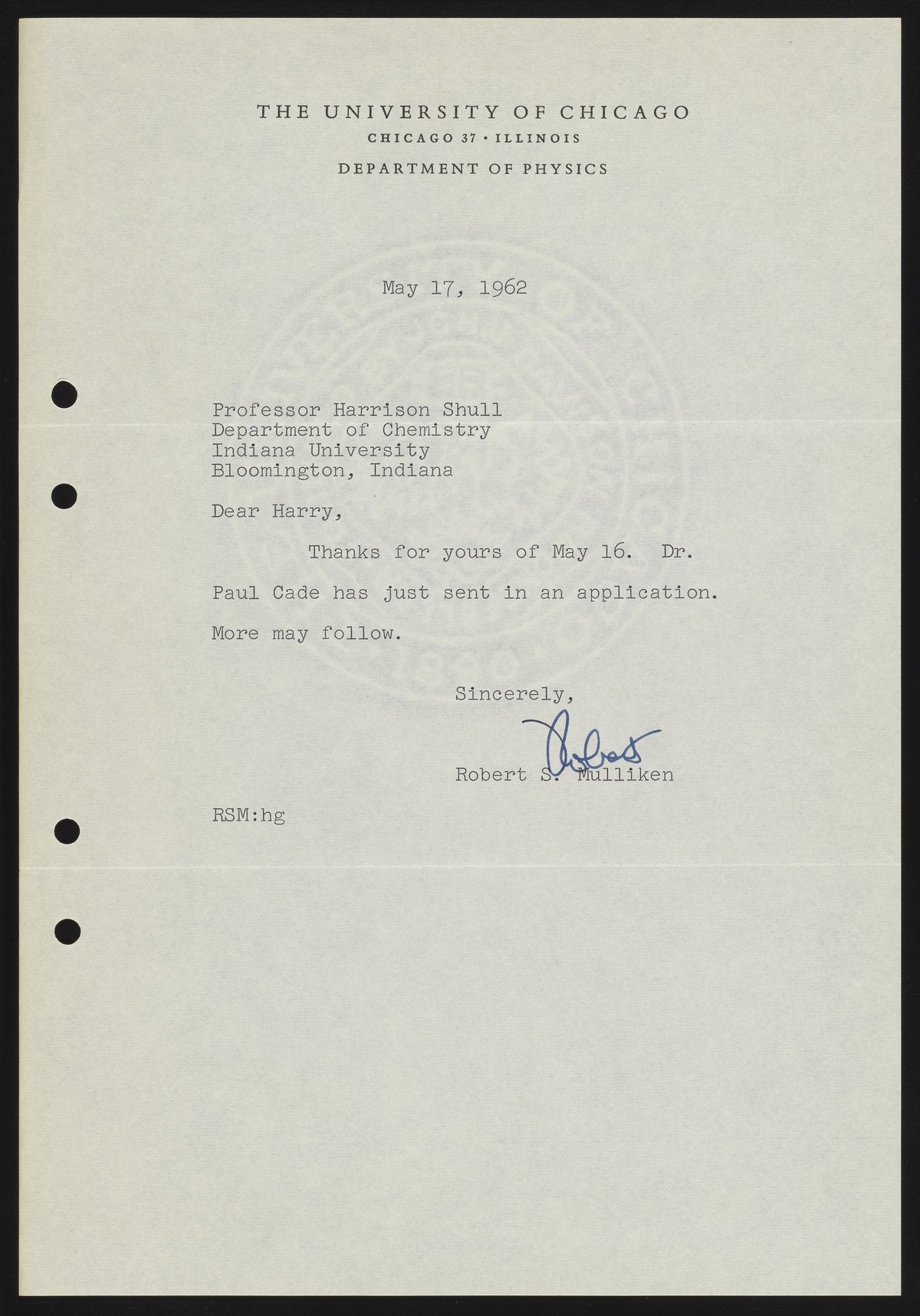 Letter between Robert S. Mulliken and Harrison Shull, American quantum chemists, concerning Dr. Paul Cade's application to the Gordon Research Conference.