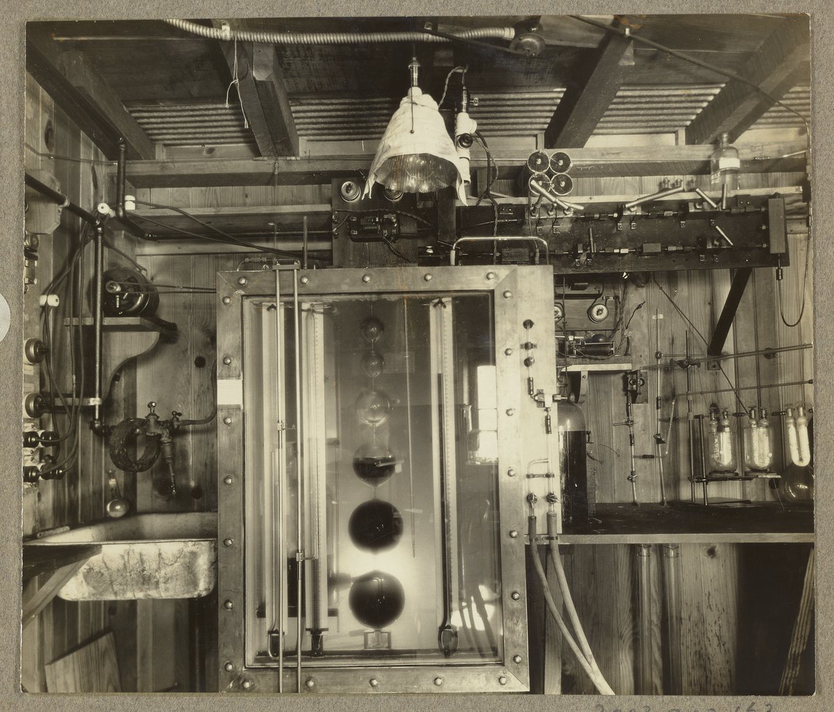 “Apparatus to Study the Compressibility of Gases,” circa 1928. Travis P. Hignett Collection of Fixed Nitrogen Research Laboratory Photographs, Box 2. Science History Institute. Philadelphia. https://digital.sciencehistory.org/works/sn009x94h.