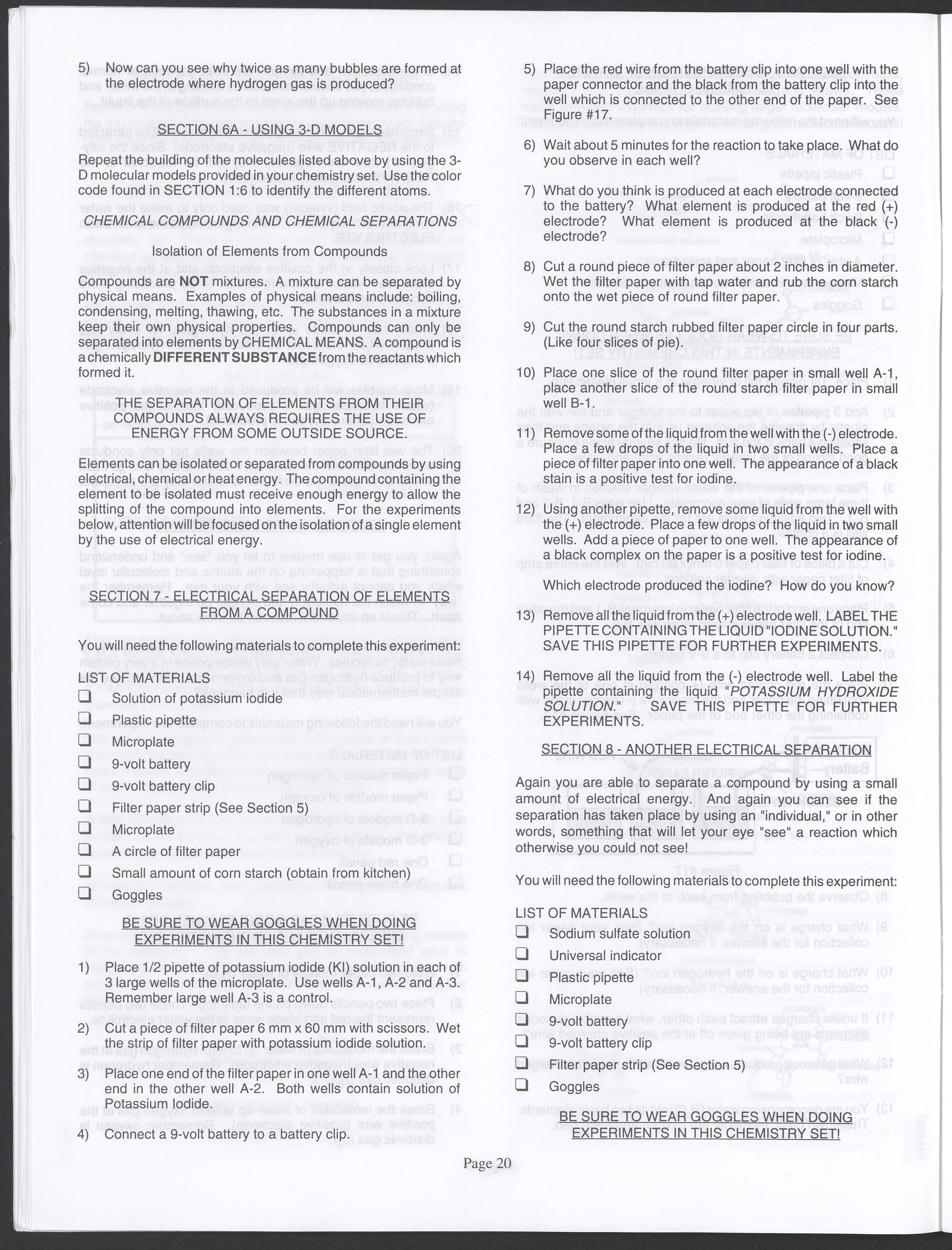 Small JPG1200 x 1571px — 264 KBLarge JPG2880 x 3771px — 1.1 MBFull-sized JPG3520 x 4609px — 1.5 MBOriginal fileTIFF — 3520 x 4609px — 46.5 MBAn instruction manual written to accompany the Smithsonian MicroChemistry XM 5000 chemistry set. Intended for use by children ages 10 and older, the manual describes how to use the set's tools, then outlines a series of experiments designed to convey the key concepts of chemical reactions, conservation of matter, phases of matter, acid-base chemistry, electrochemistry, organic chemistry, and biochemical reactions.