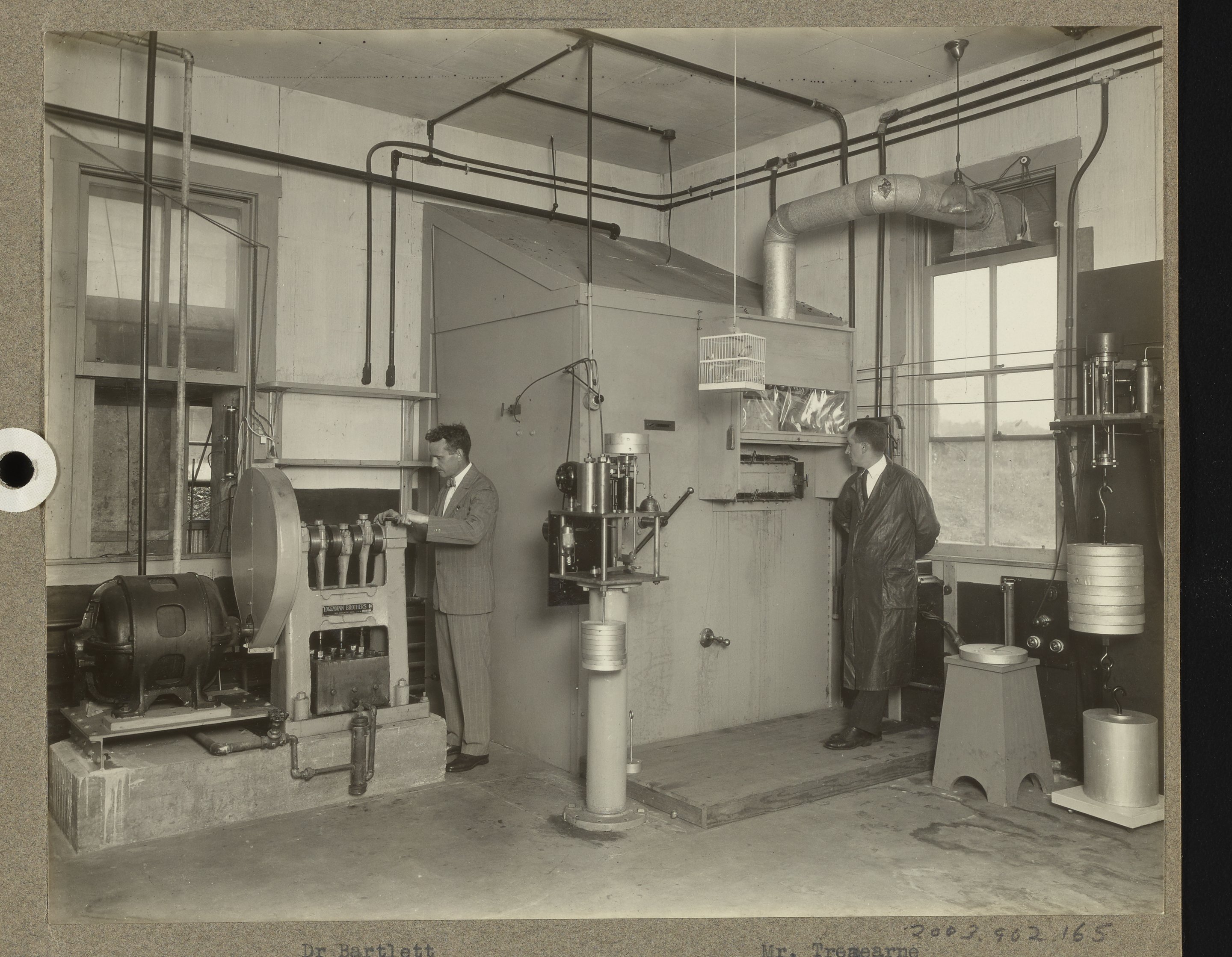 General view of assorted apparatus used in the Fixed Nitrogen Research Laboratory's High-Pressure Laboratory, including a hydraulic pressure pump, piston-type gauges, high-pressure booth, and valve manifold. The individuals present in the photograph are identified as Dr. Bartlett and Mr. Tremearne.