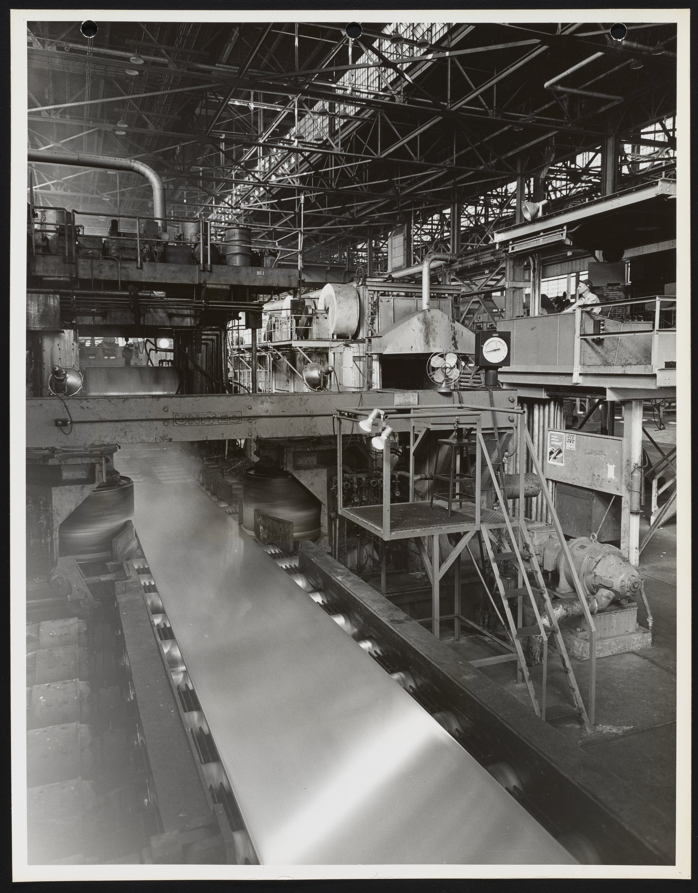 General view of a section of the magnesium rolling mill at the Dow Chemical Company facilities located in Madison, Illinois. Dedicated in 1954, the magnesium fabrication plant in Madison was the world's first facility designed for the mass production of magnesium mill products and boasted the first large-scale magnesium sheet mill, as well as the largest extrusion facilities for the metal.