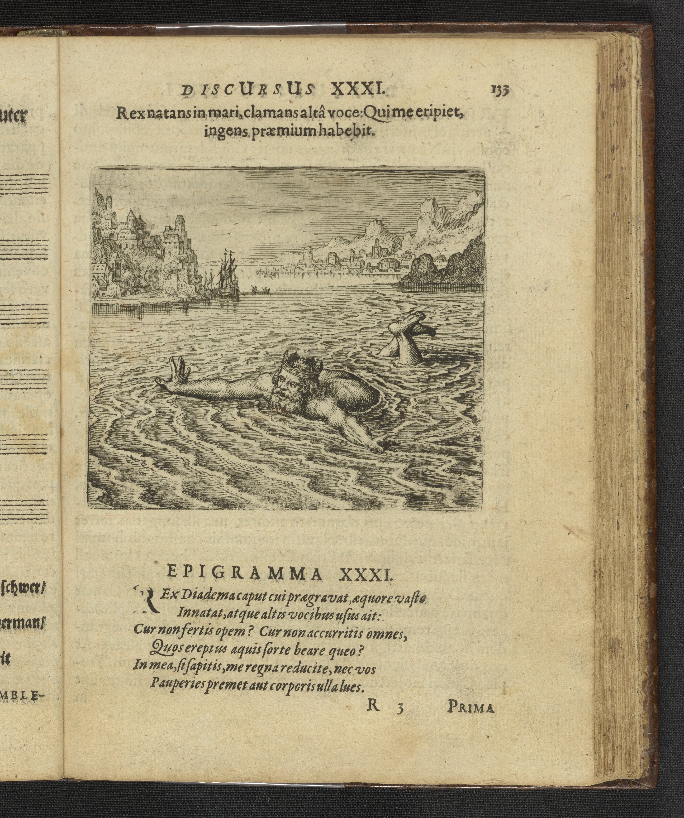 Emblem 31. The king swimming in the sea cries out with a loud voice: He that delivers me shall have a great reward.