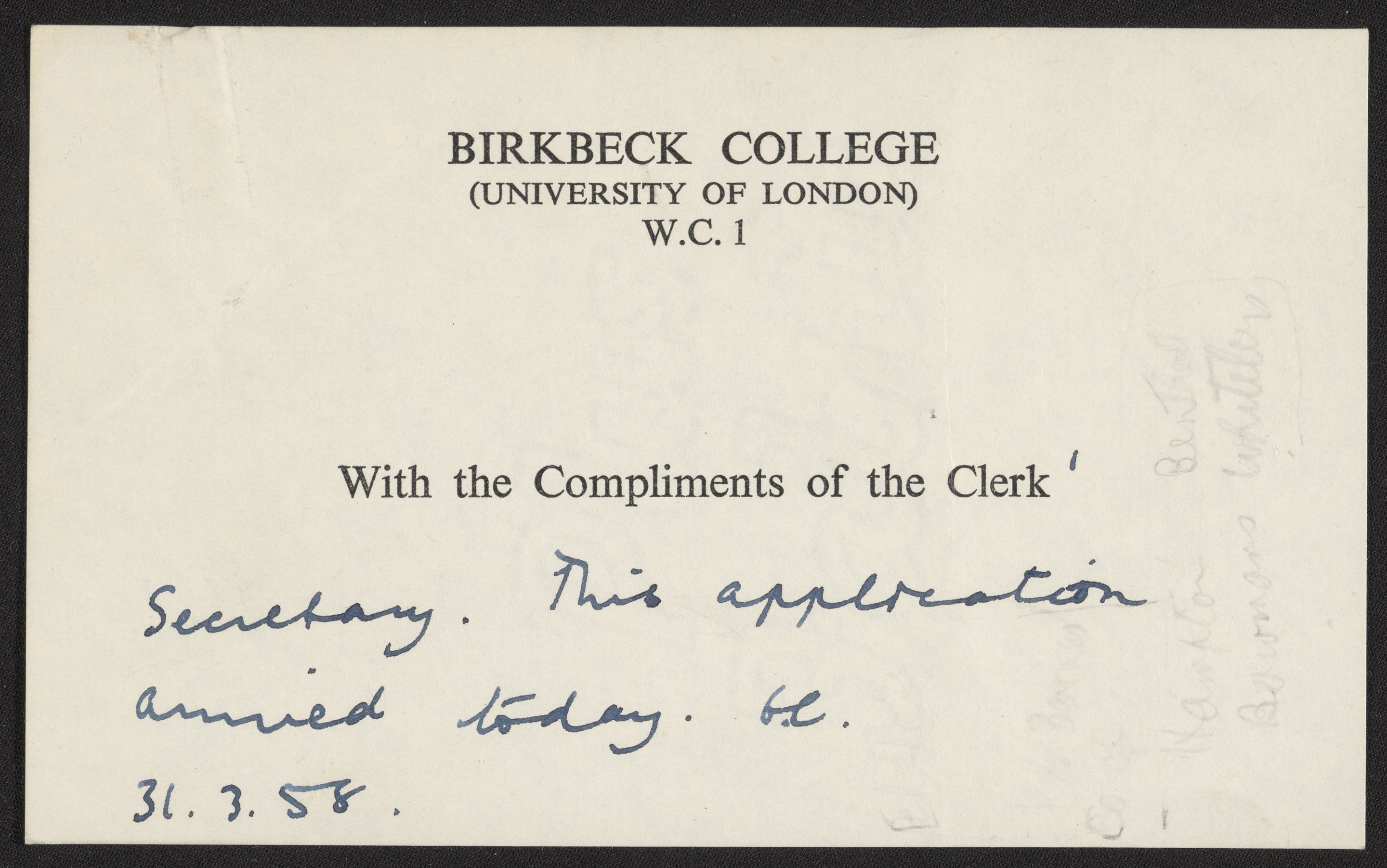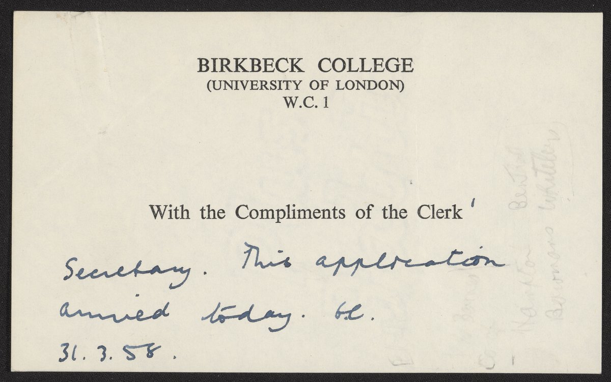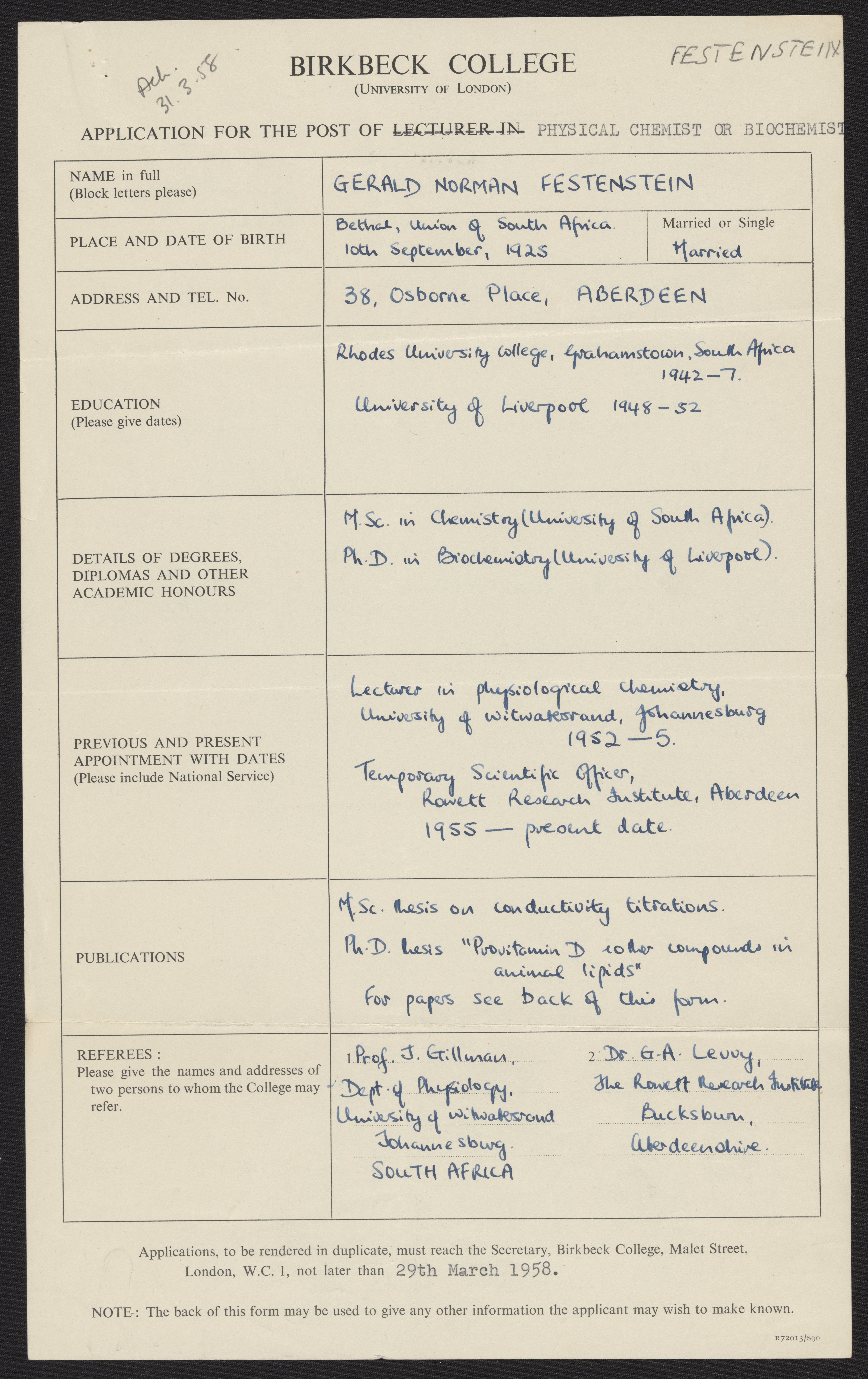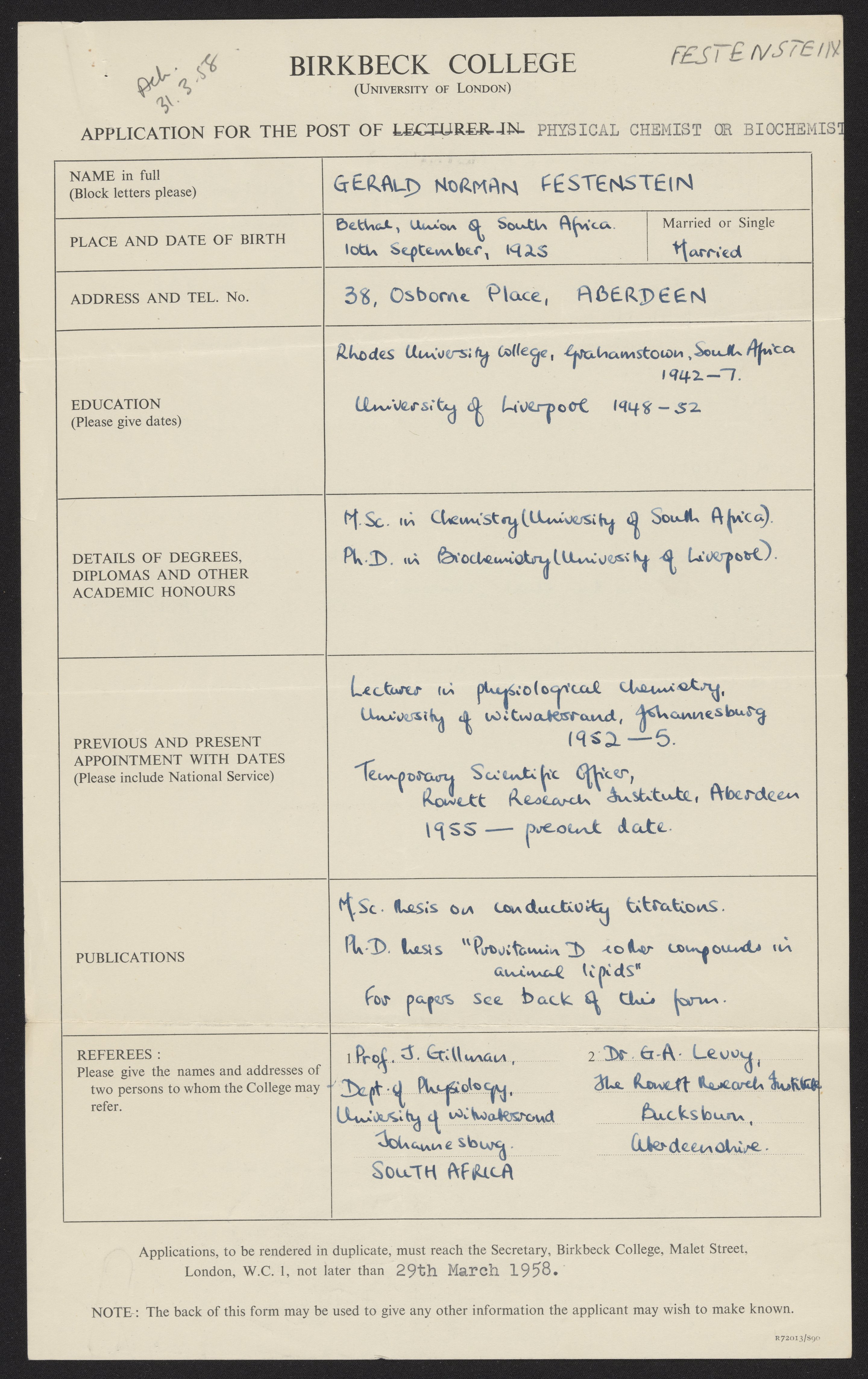 Gerald Norman Festenstein's application to Birkbeck College