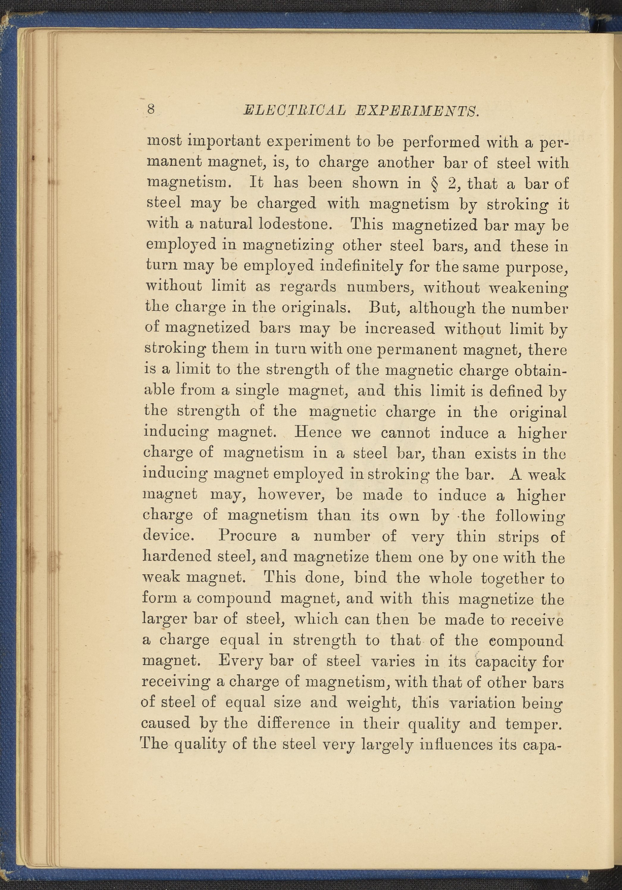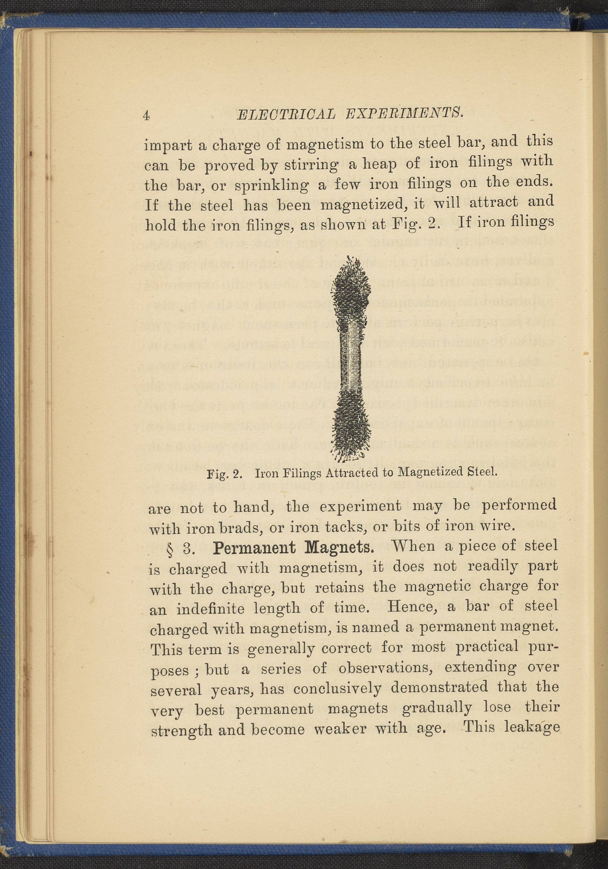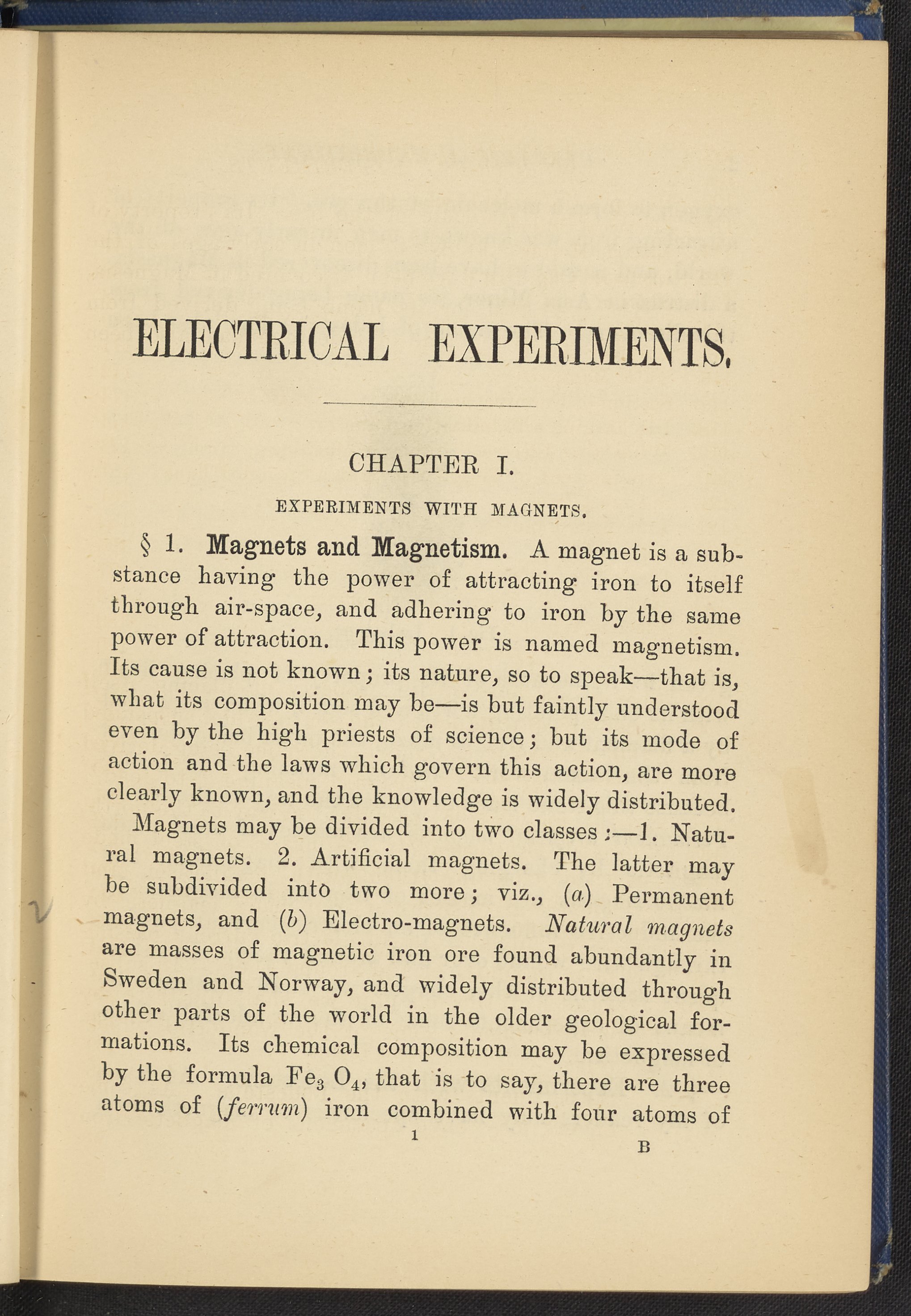 Small JPG1200 x 1571px — 494 KBFull-sized JPG2284 x 2991px — 1.5 MBOriginal fileTIFF — 2284 x 2991px — 19.6 MBWritten to show how electrical apparatus can be assembled at little cost for engaging instruction of scientifically-curious youth, this work includes descriptions of simple experiments that demonstrate elementary concepts of magnetism and electricity. Work is thoroughly illustrated and digitized in its entirety.