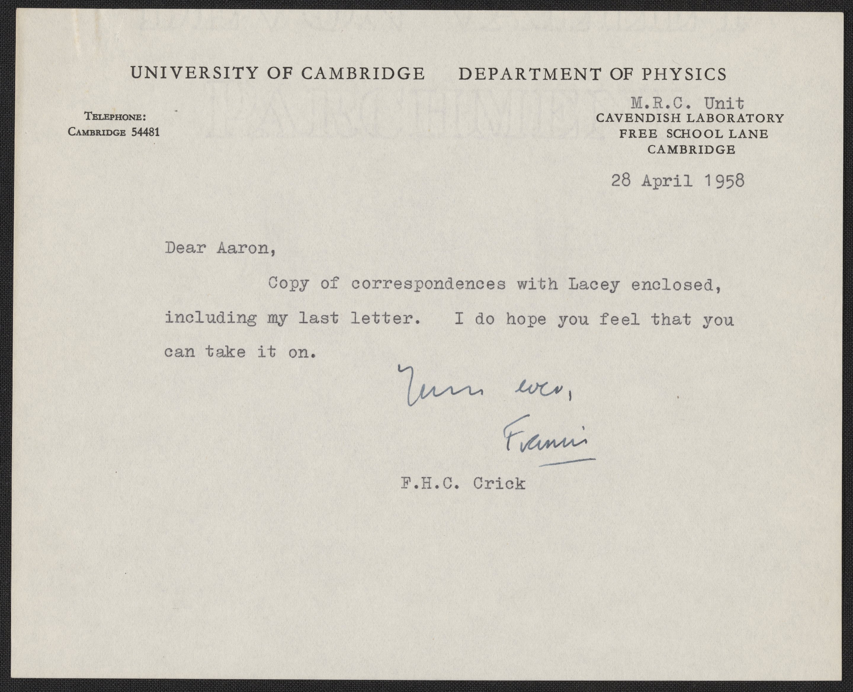 Letter from Francis Crick to Brian Westgarth Lacey, April 28, 1958