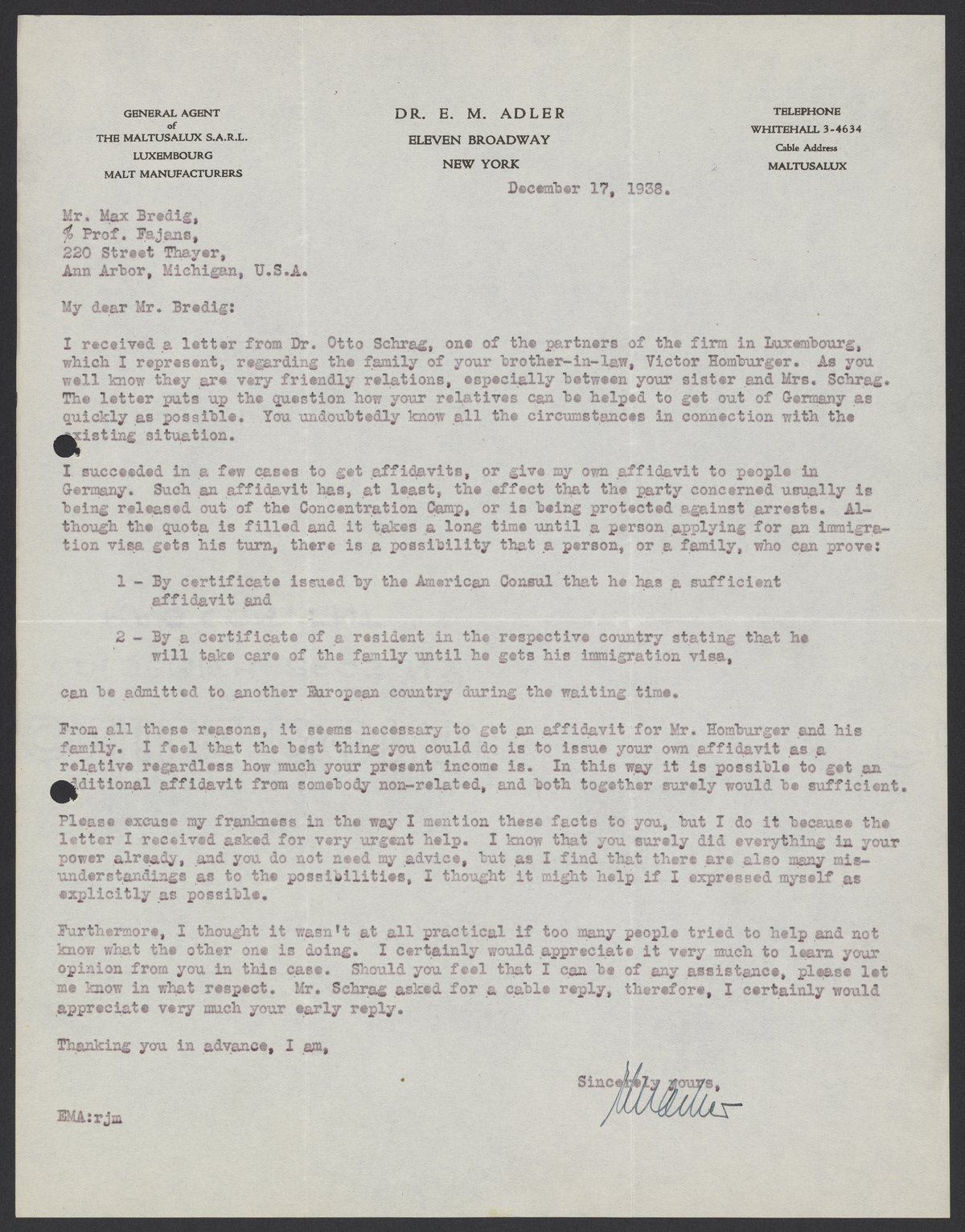 E.M. Adler advises Max Albert Bredig (1902-1977) that he acquire Viktor Homburger (1888-1968) and Marianne Homburger (1903-1986) affidavits for immigration. Alder suggests that there be two affidavits, one from Bredig and another by a non-family member.