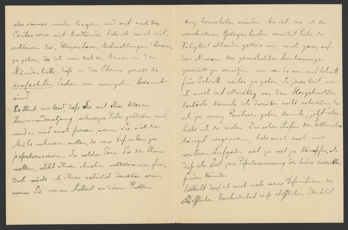 aber immer wieder liegen, und erst nach der Controverse mit Bodländer habe ich mich entschlossen die „Elemtaren Betrachtungen“ herauszugeben, da ich nun doch den Beweis in den Händen hatte, daß in der Chemie gerade die einfachsten Sachen am wenigsten bekannt sind.