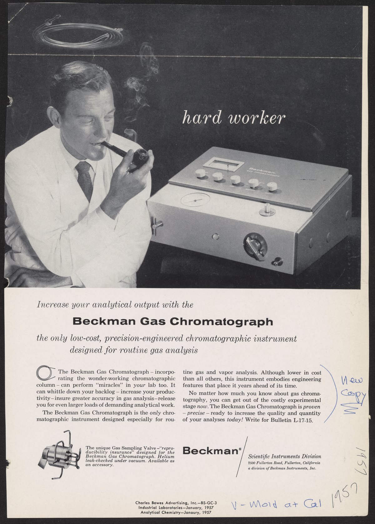 Beckman Instruments, Inc., and Charles Bowes Advertising. “Hard Worker,” 1957. Beckman Historical Collection, Box 49, Folder 14. Science History Institute. Philadelphia. https://digital.sciencehistory.org/works/sx61dm316.