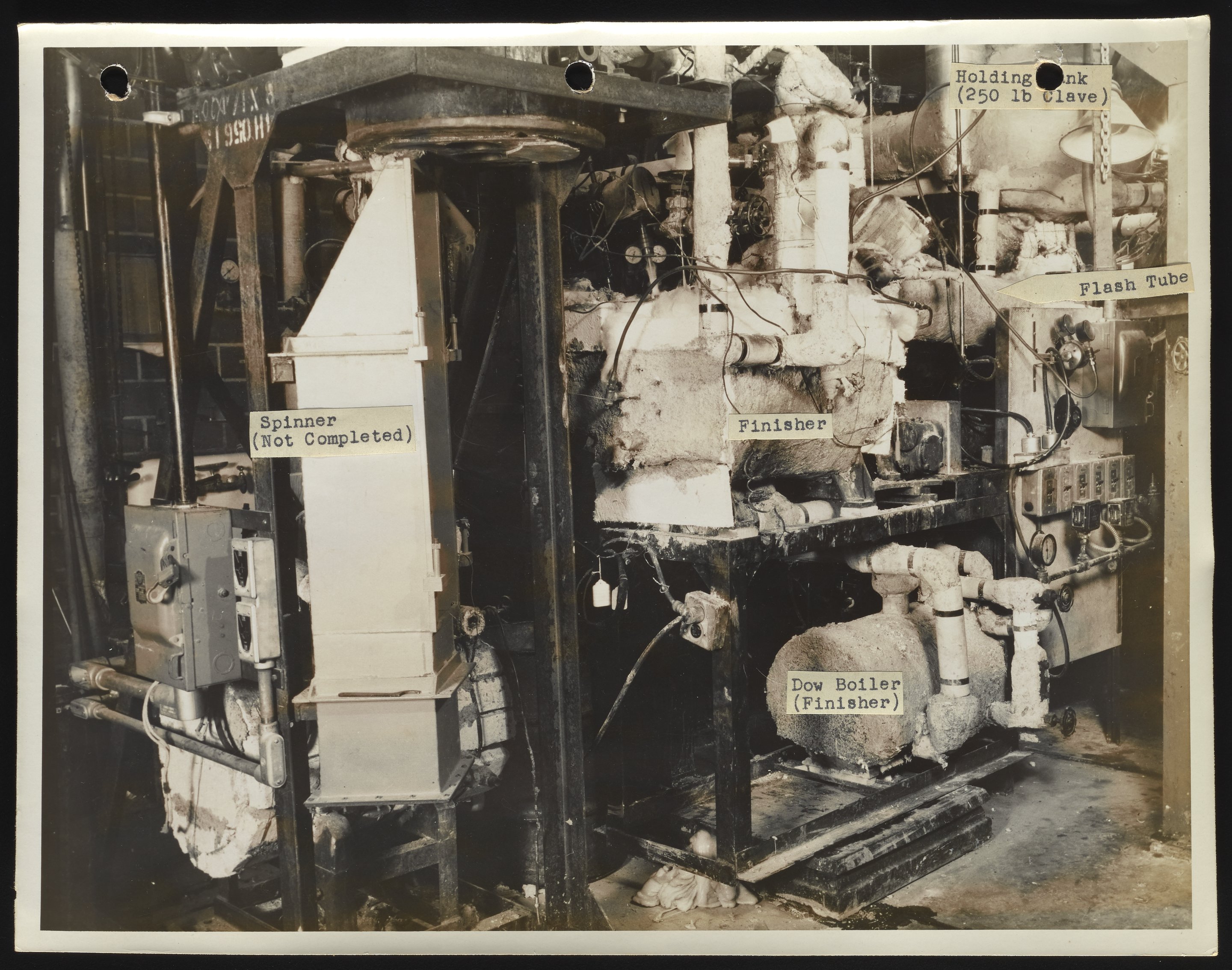 General view of component parts, including a holding tank, flash tube, spinner, and finisher, of a continuous polymerizer used during the early stages of synthetic fiber production and research at DuPont.