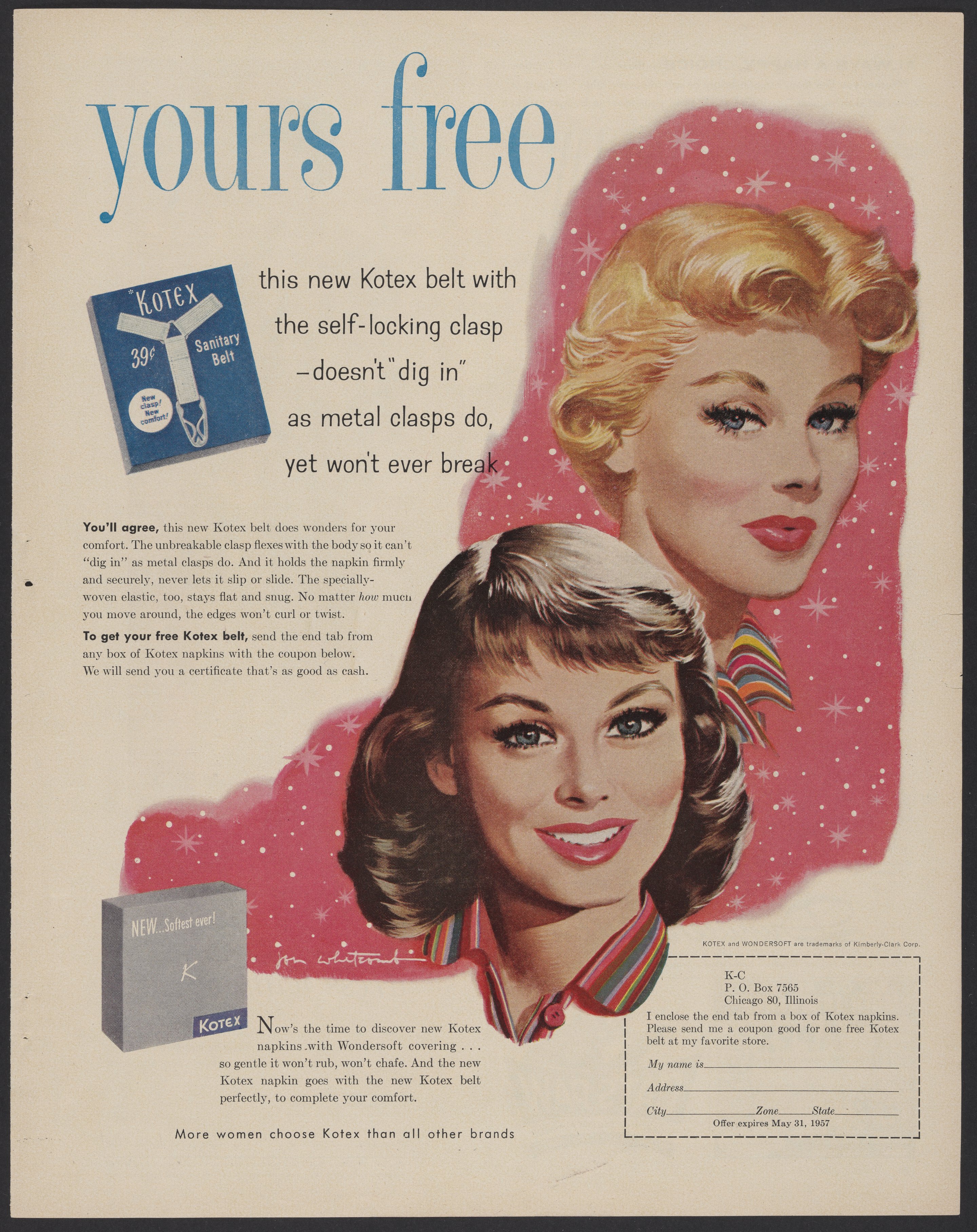 Kimberly-Clark Corporation. “Kotex Sanitary Belt Advertisement.” United States, 1957. Science History Institute. Philadelphia. https://digital.sciencehistory.org/works/sy7z9k3.