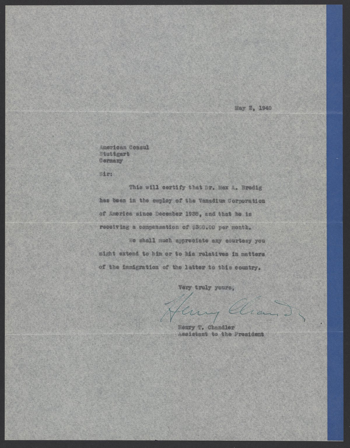 Chandler, Henry T. “Letter from Henry T. Chandler to the American Consul of Stuttgart, Germany,” May 2, 1940. Papers of Georg and Max Bredig, Box 7, Folder 19. Science History Institute. Philadelphia. https://digital.sciencehistory.org/works/t0vfgu5.