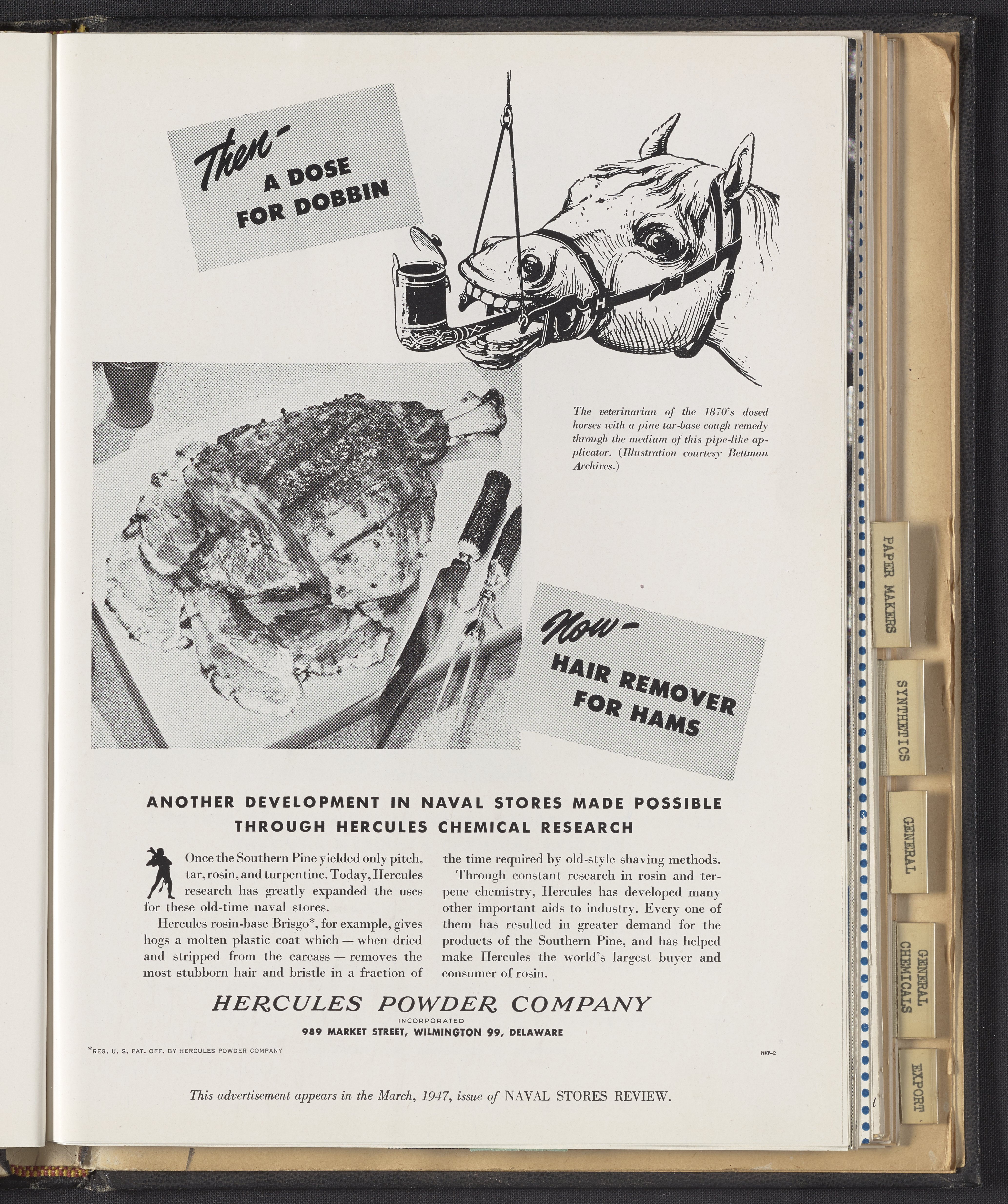Hercules Incorporated. “Then, a Dose for Dobbin...Now, Hair Removal for Hams.” 1947 Hercules Advertisements, 1947. Records of Hercules Incorporated, Volume 1947. Science History Institute. Philadelphia. https://digital.sciencehistory.org/works/t148fh895.