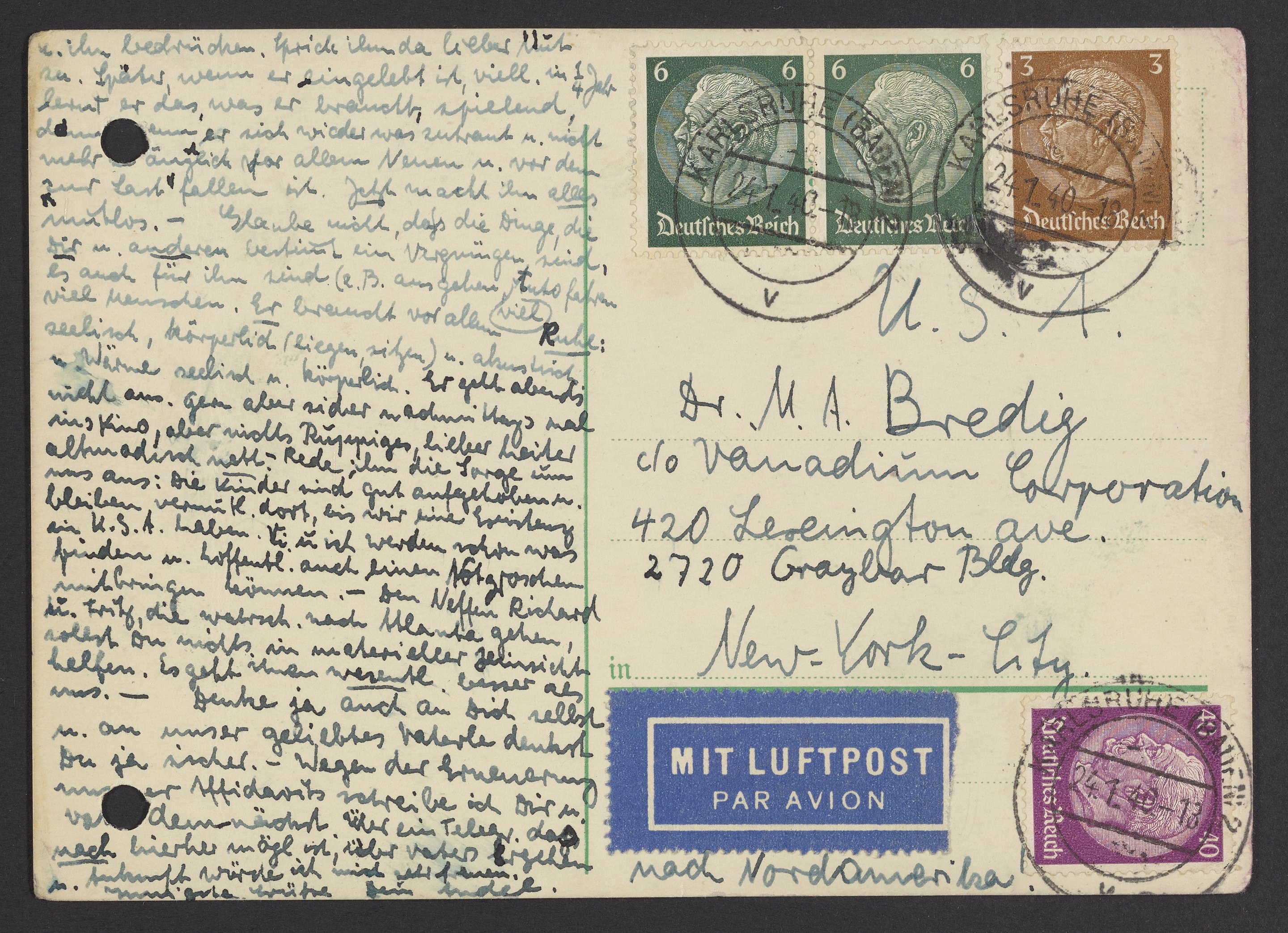 Postcard to Max Bredig from his family, November 2, 19391939-Nov-02 – 1939-Nov-03